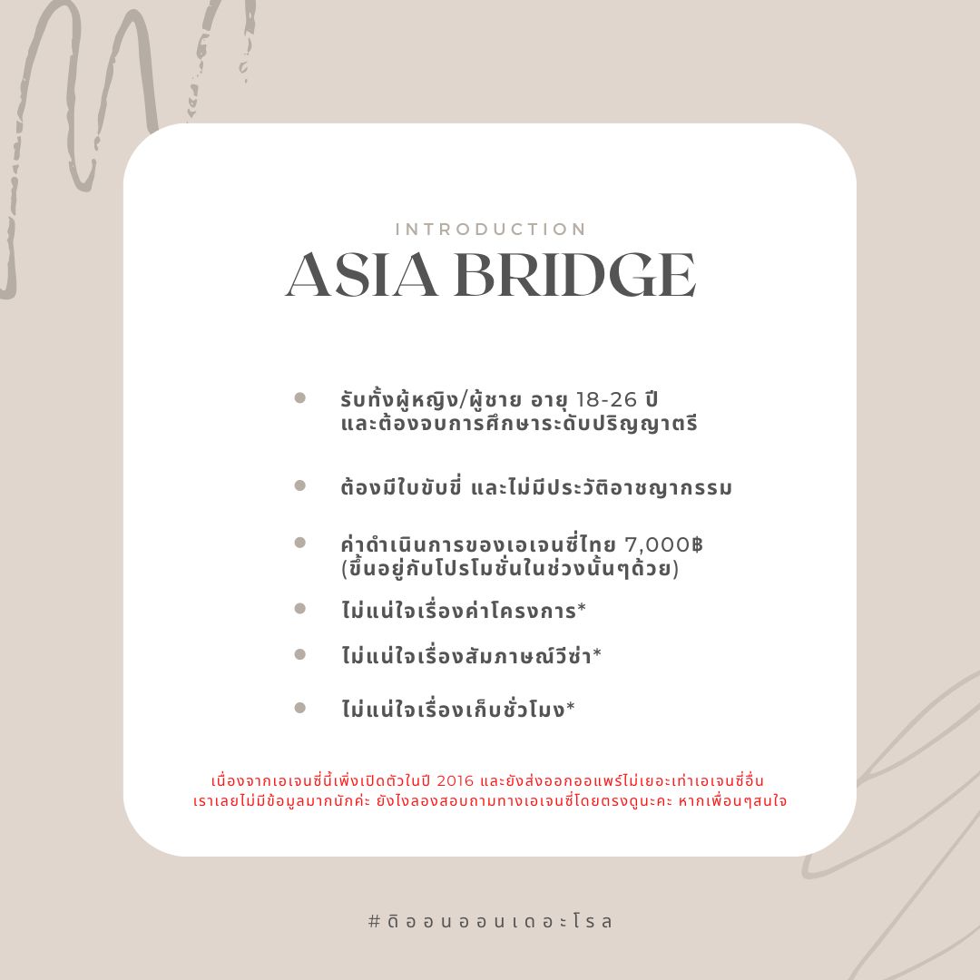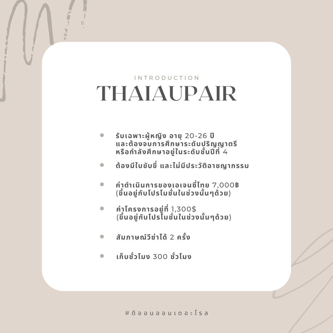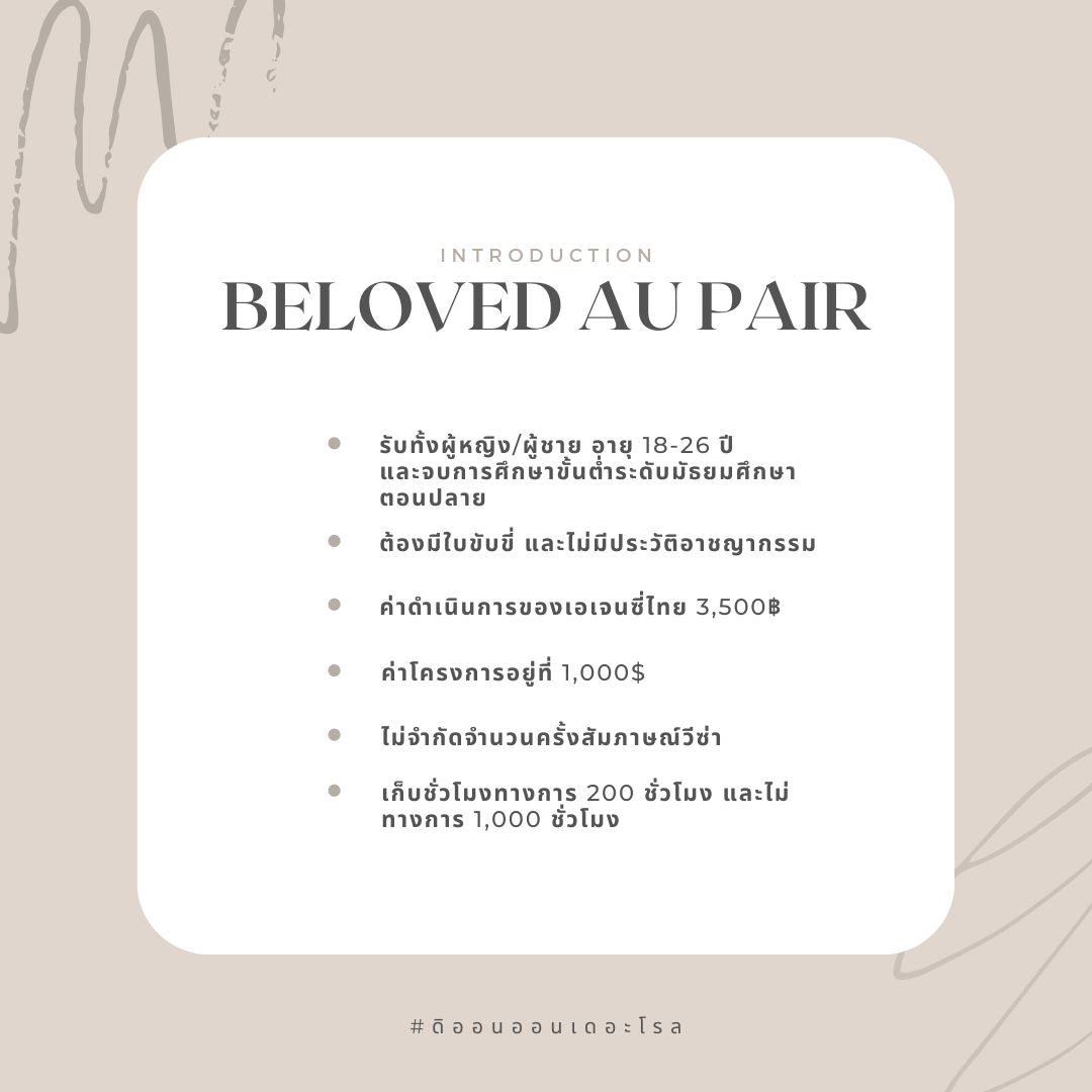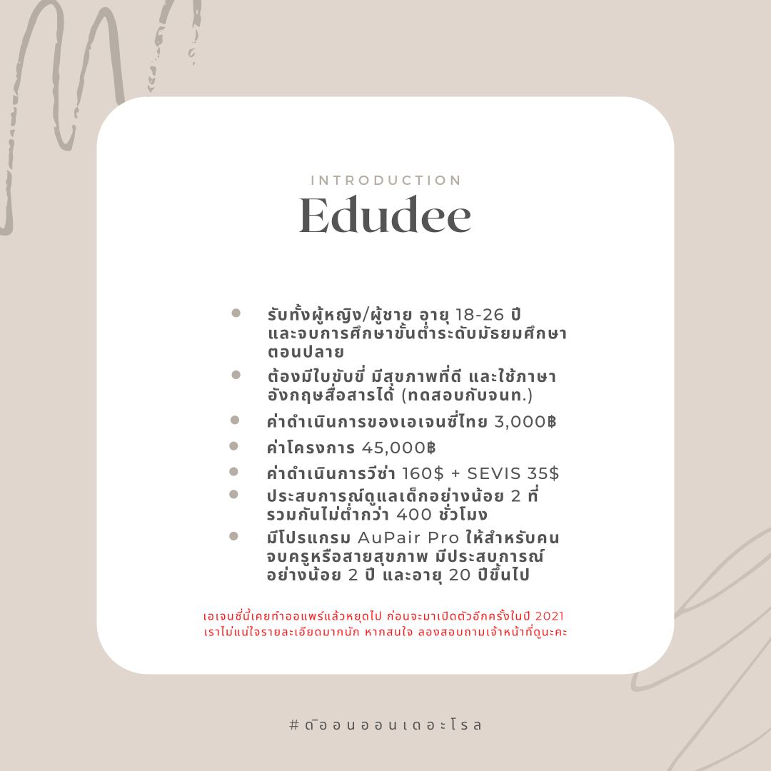 คลิก (จ่ายค่าโครงการหลังสัมภาษณ์วีซ่าผ่าน)           4) Beloved Thai Au Pair - เอเจนซี่นี้เราเห็นโฆษณาผ่านเฟสบุ๊คบ่อยมากค่ะ ตอนกำลังเลือกเอเจนซี่ก็มองไว้อยู่เหมือนกัน แต่ก็ไม่ได้สอบถามไป ยังไงลองศึกษาในเว็บไซต์ของเอเจนซี่ดูนะคะ คลิก           5) Asia Bridge - เอเจนซี่นี้เปิดมาไม่กี่ปีเองค่ะ แต่เคยได้ยินจากในกลุ่มบ่อยๆ เราเอาข้อมูลที่แสดงในเว็บมาเล่าสู่กันฟังเท่านั้น ไม่ได้รู้ข้อมูลเยอะ ยังไงลองสอบถามทางเจ้าหน้าที่ดูนะคะ หากเพื่อนๆท่านใดสนใจเอเจนซี่นี้ คลิก           6) Engenius - อันนี้มาใหม่เลยค่ะ เห็นว่ามีทุนเยอะมาก เพราะเพิ่งเปิดใหม่ น่าจะหากลุ่มลูกค้าใหม่ เรารวบรวมข้อมูลจากเว็บไซต์ของเอเจนซี่มานะคะ แต่ไม่ได้ทราบลึกๆว่ามีรายละเอียดยังไง ทุกคนลองศึกษาข้อมูลเพิ่มเติมจากเว็บไซต์เอเจนซี่ดูนะคะ คลิก      7)  Edudee - เราได้ข่าวแว่วๆจากเอเจนซี่นี้มาบ้างในช่วง 3-4 เดือนนี้ค่ะ เหมือนเขาเป็นเอเจนซี่ที่ส่งออก W&T มามากมาย เคยทำออแพร์มาก่อน แล้วหยุดไป ตอนนี้กลับมาทำออแพร์อีกรอบแล้วนะคะ มีโปรโมชั่นพิเศษให้กับสายครูและสายสุขภาพด้วย ยังไงลองอ่านเพิ่มเติมในเว็บไซต์ของเอเจนซี่ดูได้นะคะ เราว่าน่าสนใจอยู่เหมือนกัน ลองดูค่ะ