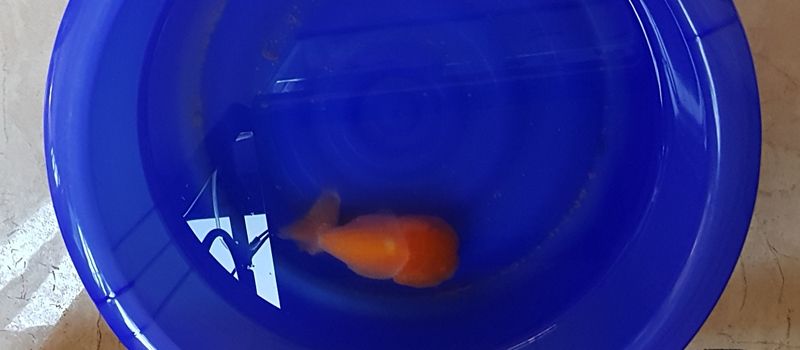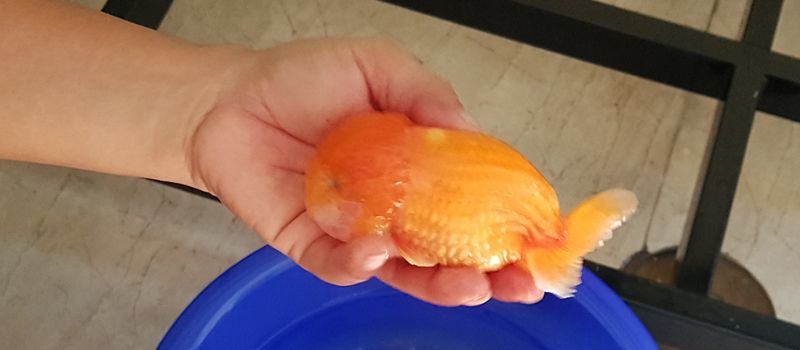 เรานั่งอ่านหนังสือไปเรื่อยๆ จนมองไปที่ตู้ปลา เห็นน้ำลดเหลือไม่ถึงครึ่ง ความจริงก็เห็นตั้งแต่ไปยืนมองพี่ น. ผ่านหน้าต่างแล้วแหละ แต่เพิ่งมาสังเกตว่ามีปลาทองแค่ตัวเดียว เลยเดินไปดูใกล้ๆ เลยเห็นปลาทองอีกตัวอยู่ในกะละมัง คือแยกมาแบบนี้มีสิทธิ์ตาย แต่เราไม่ได้ไปยุ่งไรกับมัน