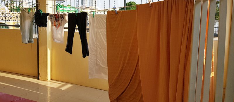 อาบน้ำและซักผ้า ซักทุกวัน จนคิดว่าใส่ซ้ำได้มั้ย ซักอ่ะไม่เท่าไหร่ แต่ต้องขึ้นไปตากต้องผ่านชั้น 3 - 5 คือกลัว เรื่องผีวนเวียนในหัว และปิดไฟ ไม่มีคนอยู่ ปกติเป็นคนกลัวผีมาก มาอยู่ที่นี่ ตอนนอนก็ใส่สายสิญจ์นอนแม้ไม่รู้เอาสายสิญจ์นี้มาจากวัดไหน หมอนข้างๆ ก็พระ และบทสวดมนต์