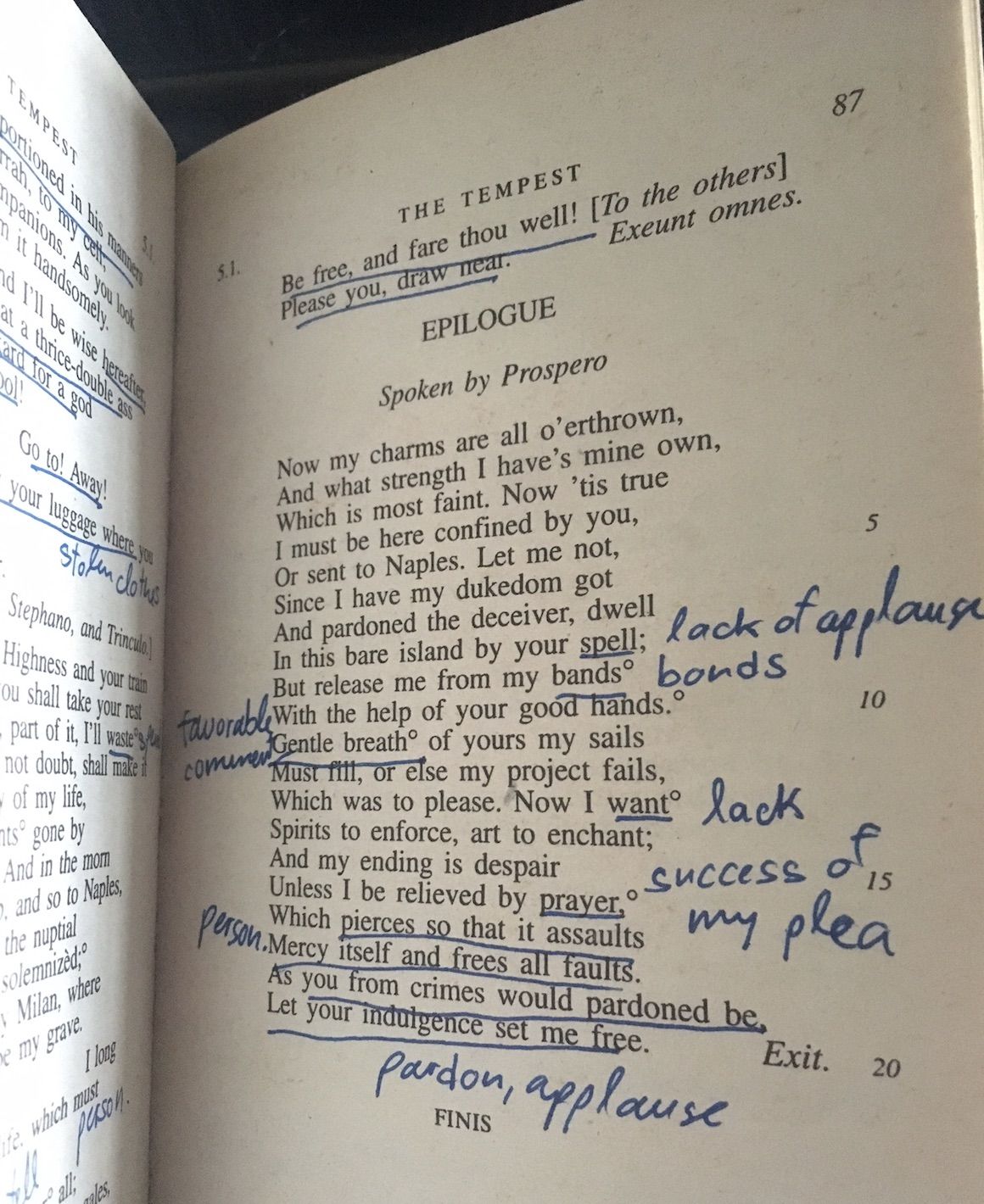 "คนเราจะไม่พูดว่า 'ปล่อยฉันให้เป็นอิสระ' เว้นว่ายังไม่เป็นอิสระแล้วหรอก - You don't say 'set me free' unless you're not free." ตัวละครเอกของนิยาย Hagseed กล่าว (2016, มาร์กาเรต แอ๊ดวู้ด Margaret Atwood - เกี่ยวกับผู้อำนวยการโรงละครผู้จัดโปรดักชั่นละครเชกสเปียร์ที่แสดงโดยคนคุกขึ้น)