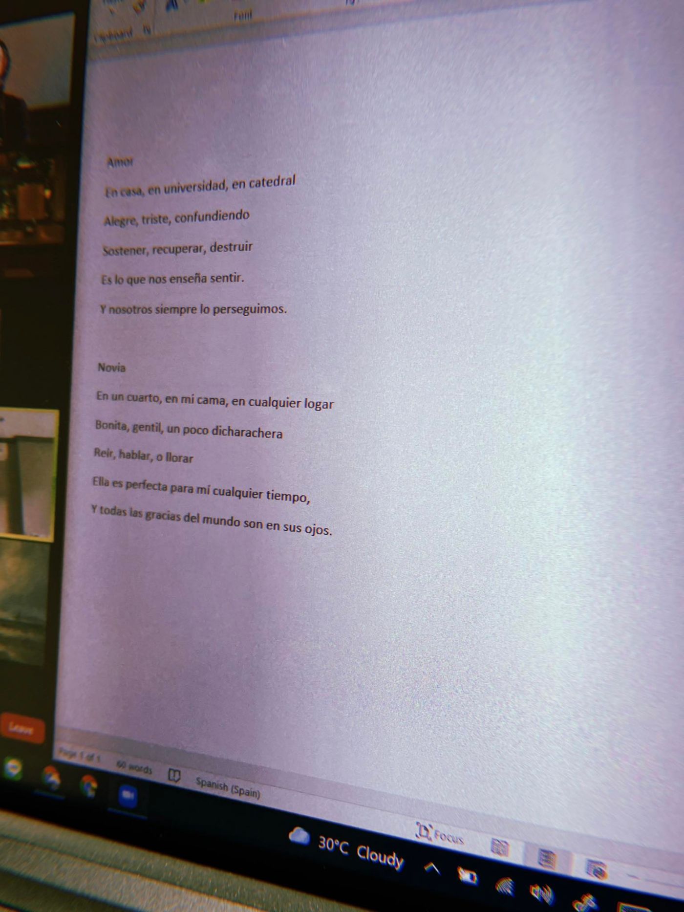 ทิ้งท้าย2 ขอฝากบทกลอน (?) en español ไว้สักเล็กน้อยจากคลาส sp compo conver พร้อมแกรมมาที่ผิดแน่ ๆ แล้วหนึ่งจุดถ้วน (son ต้องเป็น están ในบรรทัดสุดท้ายของ Novía)