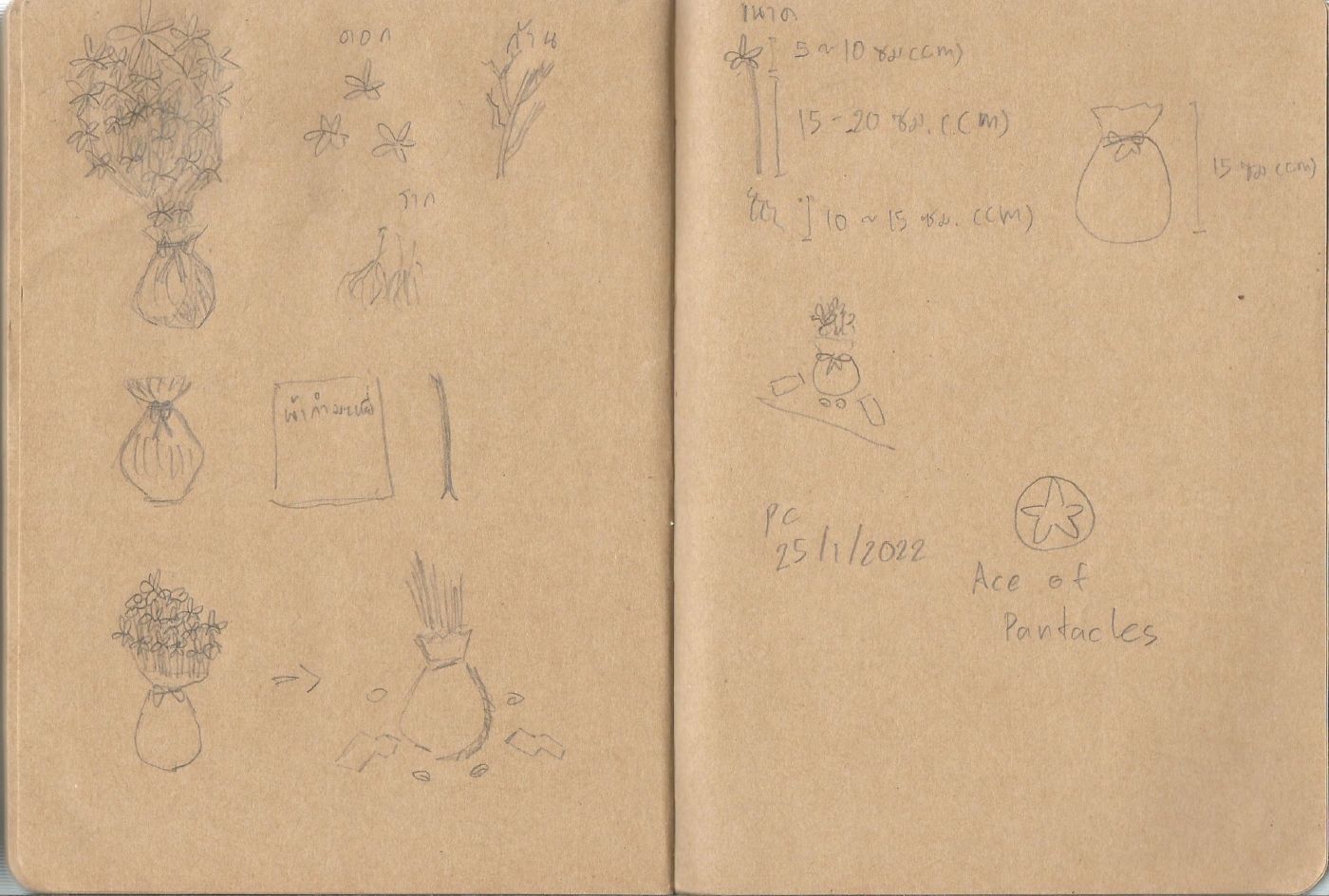 แนวคิดและแรงบันดาลใจ: ไพ่ชุดเหรียญ (Ace of Pentacles) เป็นตัวแทนของธาตุดิน พีชพันธุ์ชนิดต่างๆ เงินตรา ดิน กระถางต้นไม้ และสีโทนโลหะ (Metallic) คือ สีทองและสีเงิน
