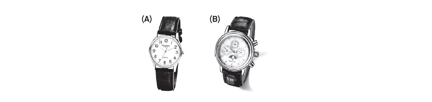 ผมเชื่อว่าหลายคนน่าจะทายผิด เพราะความจริงแล้ว ราคาของนาฬิกาเรือนแรก (A) อยู่ที่ประมาณแปดดอลลาร์สหรัฐ (ประมาณสามร้อยบาท) ส่วนราคาของนาฬิกาเรือนที่สอง (B) อยู่ที่ประมาณแปดแสนดอลลาร์สหรัฐ (ประมาณสามสิบล้านบาท)
