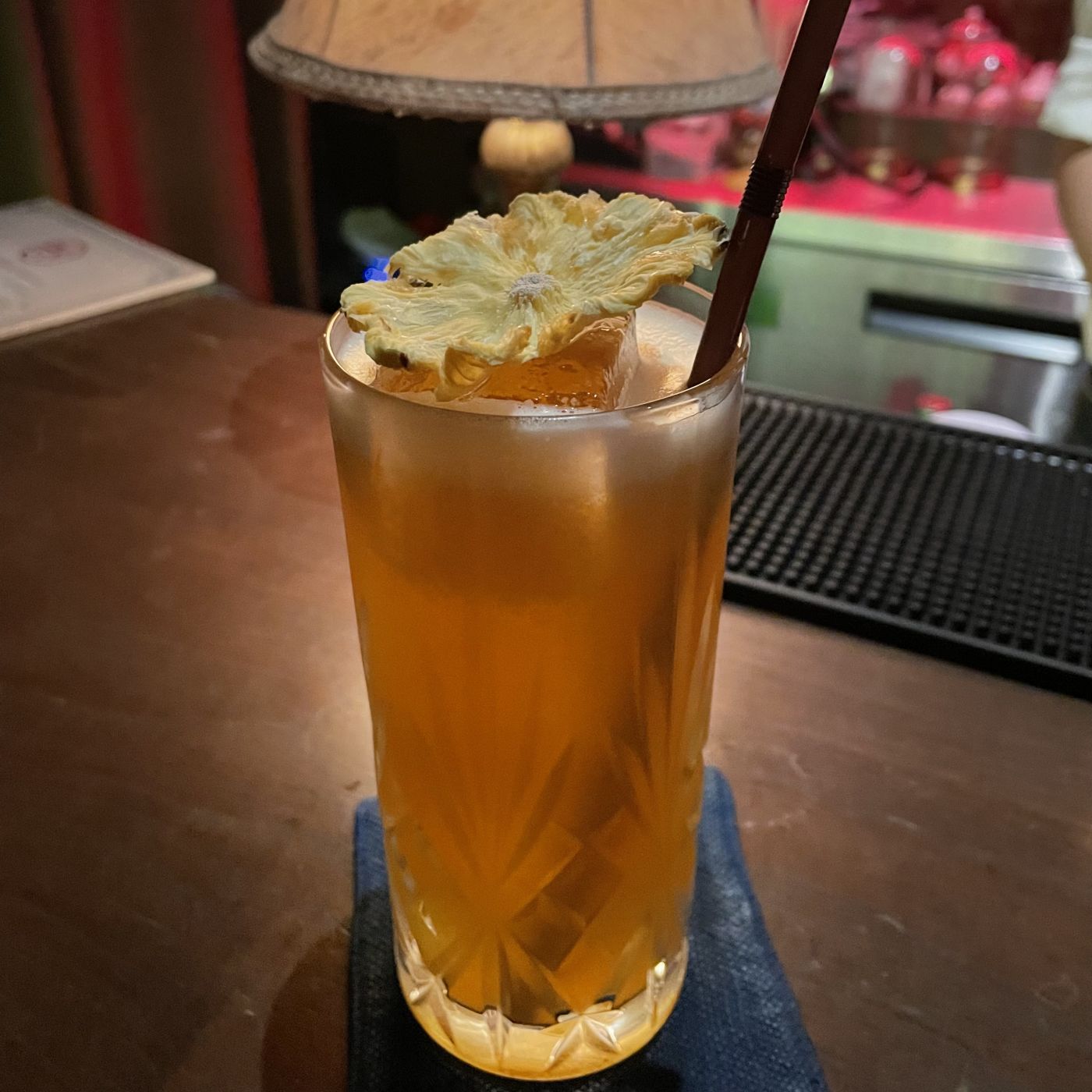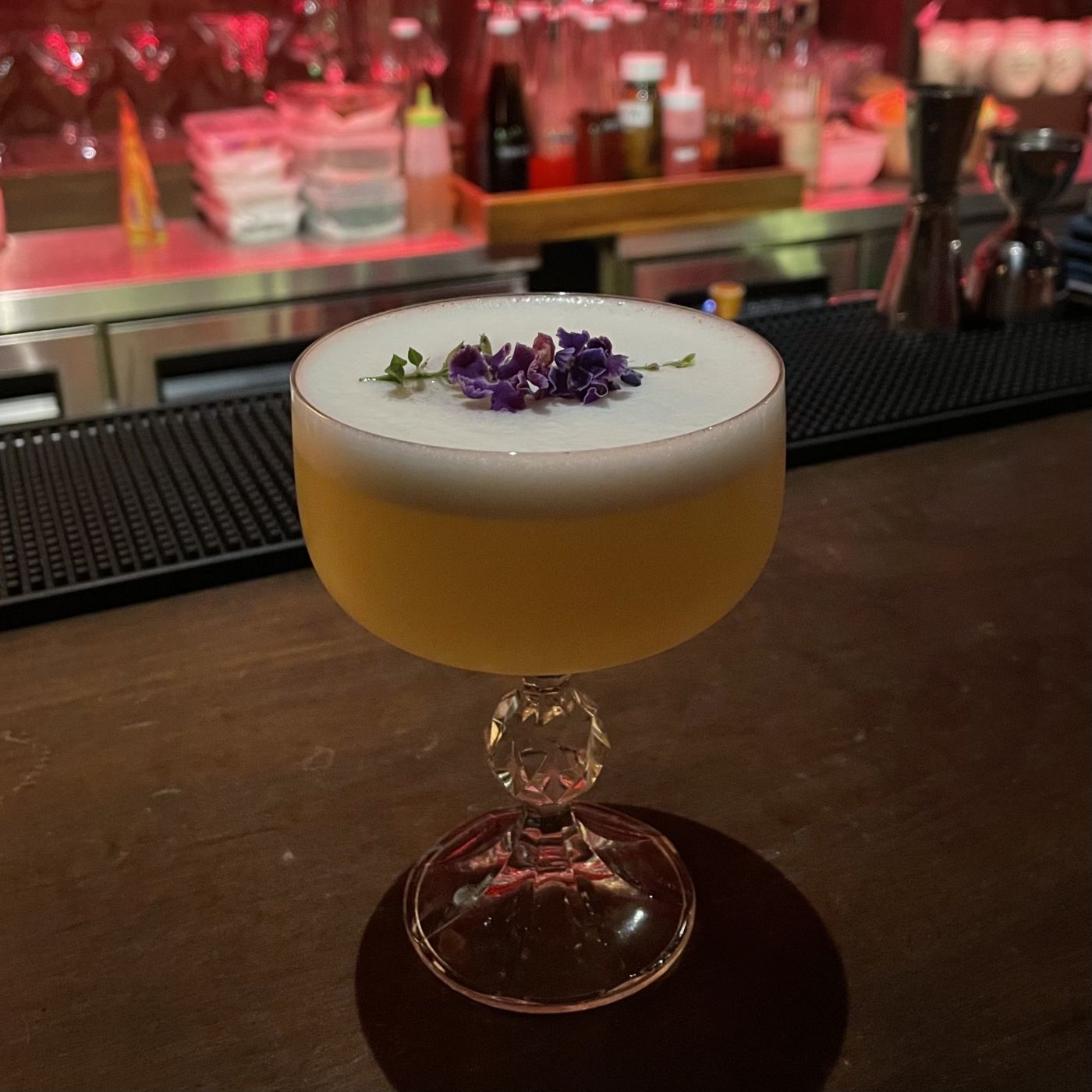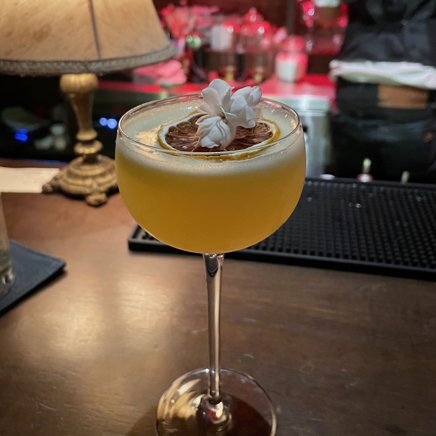 แก้วที่สอง แก้วนี้ไม่มีชื่อเรียก เรารีเควสต์ไปว่าต้องการกลิ่นยูสุ เนื่องจากตอนที่พักคอระหว่างแก้วแรกและแก้วที่สอง บาร์เทนเดอร์ทำแก้ว entertain แก้วเล็ก ๆ ให้ลอง เป็นกลิ่นยูสุที่หอมมาก เลยได้แก้วนี้มา สปิริตหลักคือจิน แก้วนี้ค่อนข้างดื่มง่าย จุดเด่นคือหอมกลิ่นยูสุมาก ตั้งชื่อให้เล่น ๆ ว่า ยู สู้ ๆ