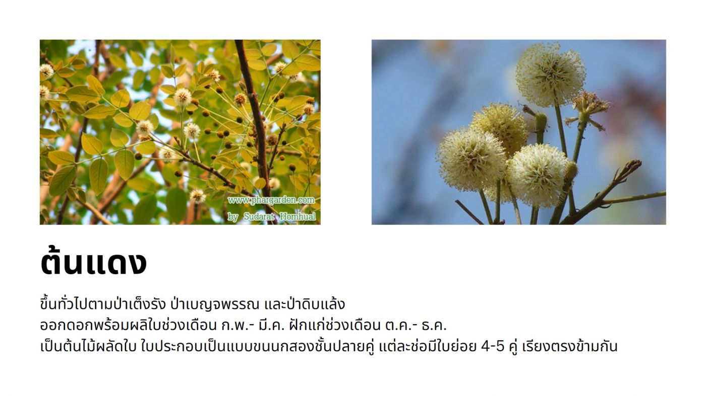 หลาย ๆ คนอาจสงสัยว่าต้นไม้ในเรื่องคือต้นอะไร ต้นไม้ที่ใช้ในเรื่องมีชื่อว่า "ต้นแดง" ค่ะ เพราะเป็นต้นไม้ที่มีขึ้นอยู่ตามป่าดิบแล้ง ป่าเต็งรัง ป่าเบญจพรรณ ซึ่งเป็นป่าที่อยู่อาศัยของเจ้าแมลงใบไม้นั่นเองค่ะ และใบของต้นแดงก็เป็นใบที่เจ้าแมลงใบไม้กินเป็นอาหารด้วยค่ะ โดยต้นแดงจะออกดอกช่วงเดือน ก.พ.-มี.ค. ซึ่งเป็นช่วงหน้าแล้ง ด้วยความที่ต้นแดงเป็นไม้ผลัดใบ แน่นอนว่าจะมีช่วงที่ใบไม้จะเปลี่ยนสีเป็นสีน้ำตาลด้วยค่ะ ซึ่งก็ตรงกับเนื้อเรื่องหน้าต่อ ๆ ไปที่เราคิดไว้ด้วยค่ะ เลยเลือกภาพที่เป็นช่วงออกดอกค่ะ ส่วนฝักของมันจะออกช่วงปลายปีค่ะ