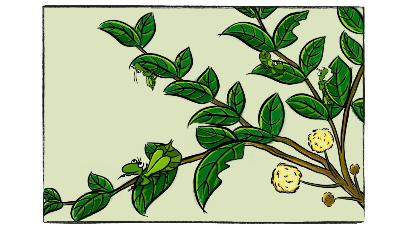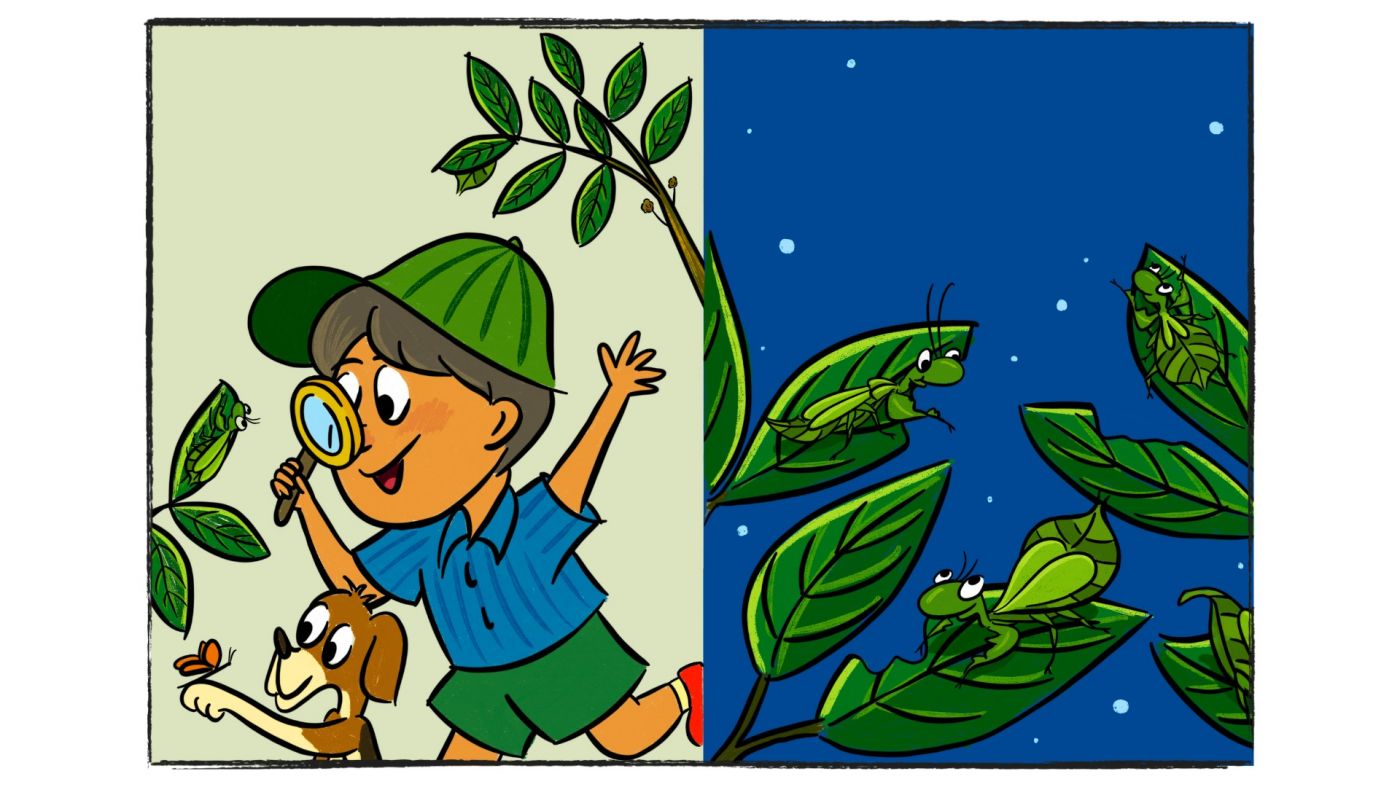 เป็นฉากที่บอกว่าเจ้าแมลงใบไม้เป็นสัตว์ที่ออกมากินกลางคืนนะ ส่วนเวลากลางวันเนี่ยมันจะเงียบสุด ๆ เลยค่ะ