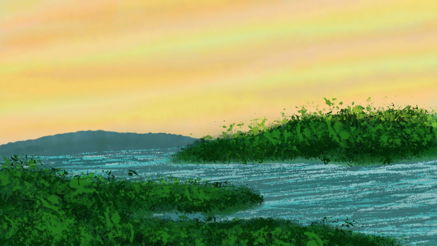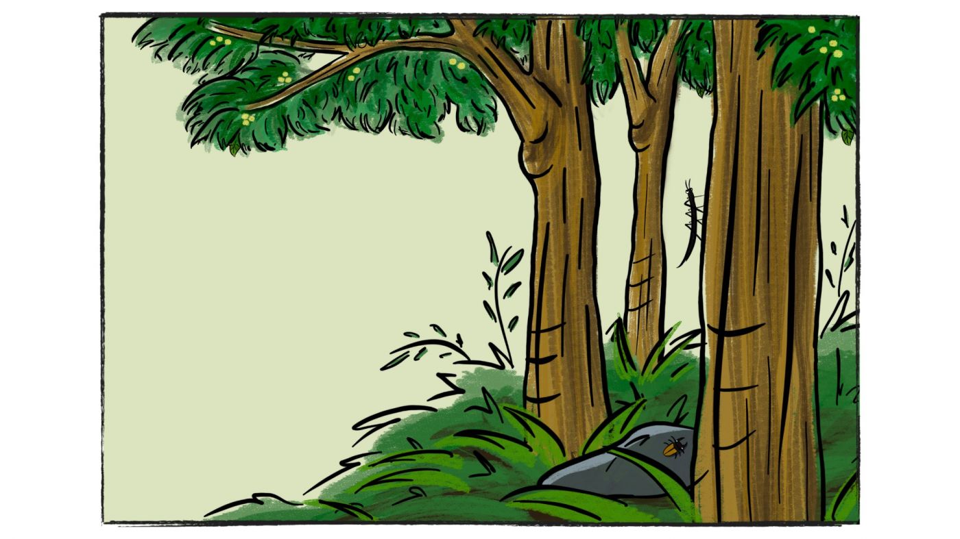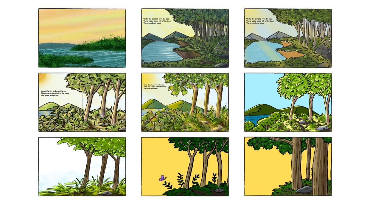 เป็นฉากเปิดเรื่องที่จะเกริ่นให้เด็ก ๆ ได้เห็นว่ามีสถานที่แห่งหนึ่งที่เป็นที่อยู่อาศัยของเจ้าแมลงใบไม้นั่นก็คือ "ป่า" นั่นเองค่ะ โดยเราก็เริ่มมาคิดว่าเราจะวาดป่ายังไงดี ให้ครอบคลุมตามเนื้อเรื่องที่เขียนไว้ จะวาดยังไงให้เห็นทั้งป่าทั้งน้ำทะเล เราก็เลยวาดออกมาคร่าว ๆ เป็นภาพนี้ภาพแรกค่ะ