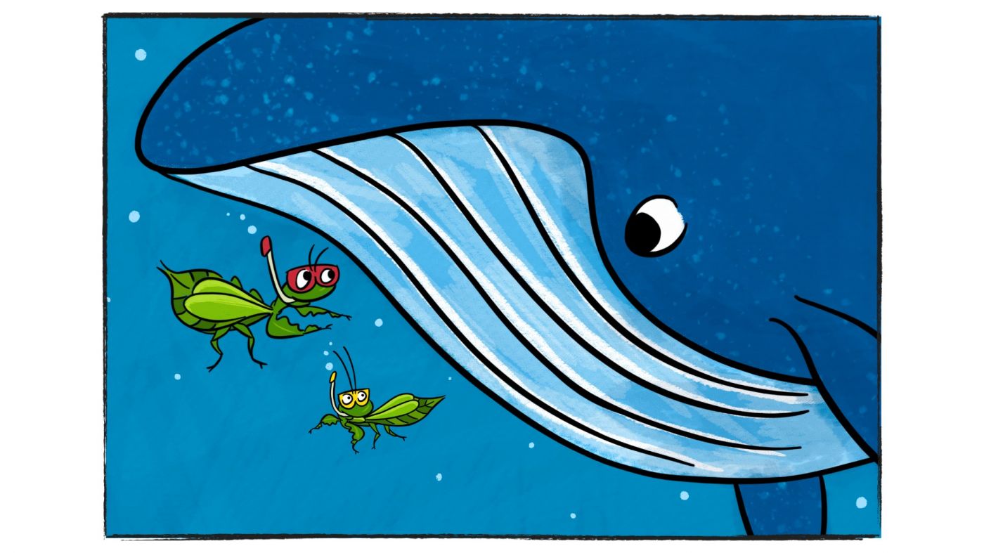 เปรียบเทียบกับเจ้าวาฬยักษ์ใหญ่แห่งท้องทะเลไปเลยค่ะ แม้ในรูปจะเห็นว่าเจ้าแมลงใบไม้ดำนำลงไปหาเจ้าวาฬใช่ไหมคะ แต่จริง ๆ แล้วน้องดำน้ำไม่ได้นะคะ 5555 เราเลยให้น้องใส่แว่นดำน้ำไปด้วย ภาพนี้จึงมีความเป็นบันเทิงคดีแทรกเข้าไปค่ะ แต่เรื่องขนาดของตัวแมลงกับวาฬเป็นเรื่องจริงค่ะ
