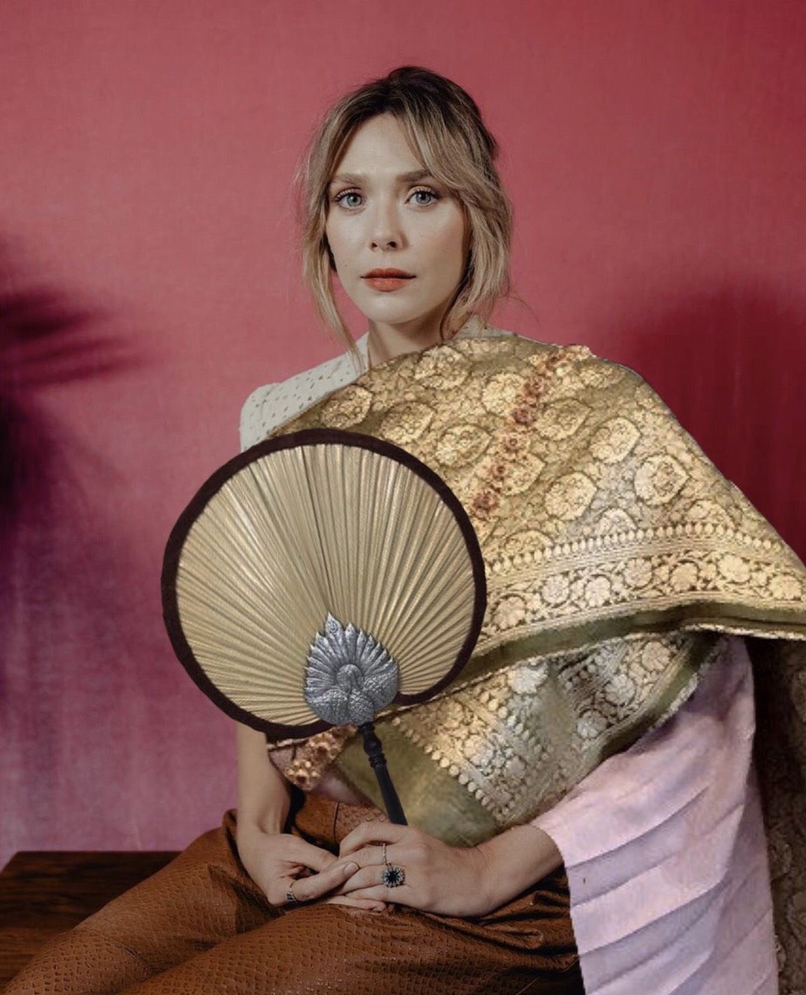 ภาพสาวฝรั่งผมสีอ่อนสวมสไบไทยช่างดูประดักประเดิด พัดแบบไทยที่ถือในมือก็ดูตั้งตรงเสียจนองค์ประกอบทุกอย่างในรูปดูแปลกปลอมไปหมด