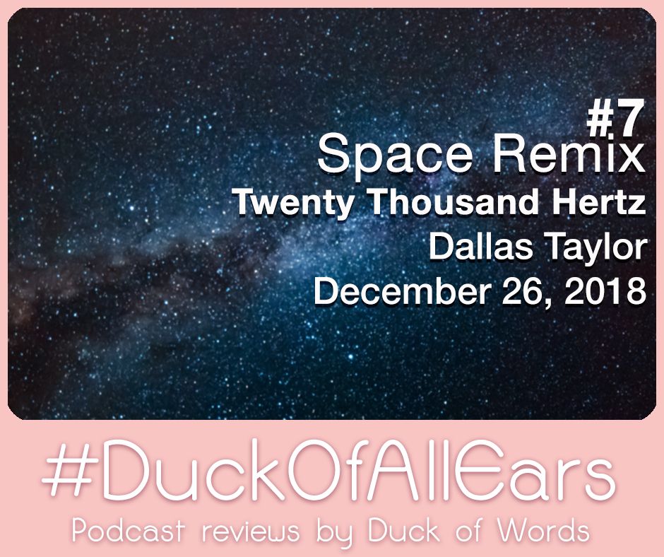 ทุกคนที่ชอบฟังพอดแคสต์สนใจเรื่องเสียงไหมคะ? แล้วมีเพื่อนคนไหนสนใจเรื่องราวเกี่ยวกับอวกาศด้วยหรือเปล่า? แต่ถ้าเกิดสนใจทั้งสองอย่างล่ะ? พอดแคสต์ที่เป็ดแนะนำชวนให้ทุกคนมาฟังวันนี้มาจากรายการ Twenty Thousand Hertz ดำเนินโดยพิธีกรหนุ่ม ดัลลัส เทย์เลอร์ ตัวรายการนำเสนอเรื่องของเสียงในแทบทุกแง่มุมค่ะ มีการอธิบายที่มา ความเป็นมา และปฏิกิริยาของสังคมที่มีต่อเสียงเหล่านั้น เช่น เสียงนกร้อง เสียงสเปเชียลเอฟเฟ็กต์ประกอบภาพยนตร์ มลภาวะทางเสียงที่เกิดจากการจัดเรียงและเลือกใช้วัสดุเครื่องใช้รอบตัวที่ทำให้เกิดการสะท้อนหรือดูดซึมเสียงต่างกัน ประวัติการปรุงแต่งเสียงเพลงในวงการดนตรี และอื่นๆ ในตอนนี้ที่ออกอากาสไปเมื่อเกือบปีที่แล้วมีชื่อว่า Space Remix ซึ่งเป็นตอนพิเศษที่ทางรายการเคยออกอากาศมาก่อนหน้า แต่ทีมงานชื่นชอบเนื้อหาในตอนเป็นพิเศษจนนำมาปรับปรุงคุณภาพ เพิ่มเพลงและเสียงประกอบใหม่ เรียบเรียงให้ออกมาเป็นผลงานที่ดียิ่งขึ้นเพื่อผู้ฟังทุกท่านค่ะ