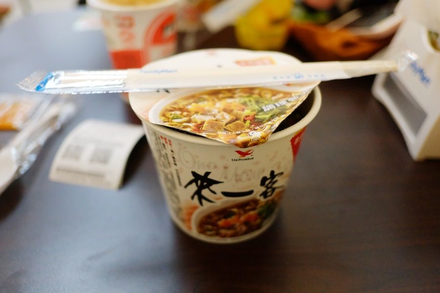 พอกลับมาถึงแถวที่พักก็เริ่มหิว ตามแพลนนี่คิดว่าคงจะไปฟาดอาหารที่ Jiufen แต่กลับไม่ค่อยได้กินอะไรเท่าไหร่ เราขี้เกียจหาร้าน เลยแวะที่แฟมิลี่มาร์ท ดีกว่าบ้านเราตรงมีที่นั่งให้กินและสะอาดด้วย (เราเคยนั่งตรง lawson อุดมสุข มันไม่สะอาดเลยอะ) พอลองเดินสำรวจดูแล้ว บะหมี่เนื้อน่าสนใจเลยเอามาลอง อร่อยดีอ่ะ