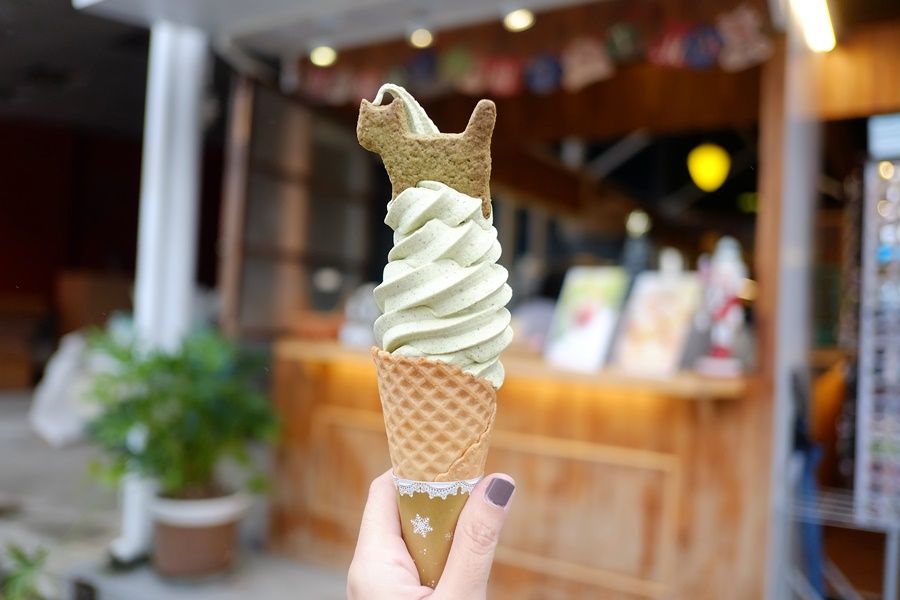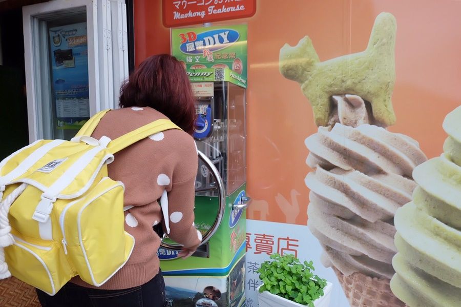 ข้อมูลในหัวคือที่นี่มีไร่ชาและร้านซอฟต์ครีม ในเมื่อเรามองเห็นร้านซอฟต์ครีมก่อนงั้นเราก็ไปหาร้านซอฟต์ครีมก่อนก็แล้วกัน ตัดสินใจง่ายเหลือเกิน มันมี 2 ร้านติดกันล่ะ หน้าตาไอติมก็เหมือนกัน เราไม่รู้จะกินร้านไหนดี แต่มองไปร้านที่เล็กกว่านั้นมีตู้ปั๊มเหรียญและมีคนกำลังซื้อ เราเลยไปร้านเล็ก 555555 ถ้าจำไม่ผิดจะชื่อ Maokong Tea House