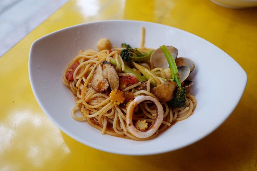 หลังจากนั้นก็เดินวนไปทางขวา เจอร้านนี้เข้า เห็นคนท้องถิ่นต่อแถวซื้อกัน มีเจ๊คนนี้ทำทุกอย่างอยู่คนเดียว รอบแรกที่ผ่านโต๊ะไม่ว่างเลยเดินวนกลับมาอีกรอบ มีโต๊ะว่าง 1 โต๊ะ เราก็จัดการใช้กูเกิลทรานสเลตพร้อมดูภาพประกอบแล้วก็สั่งมาคนละจาน