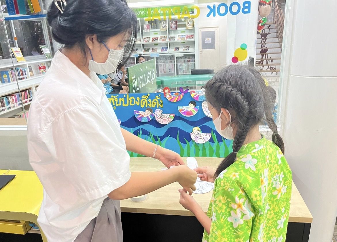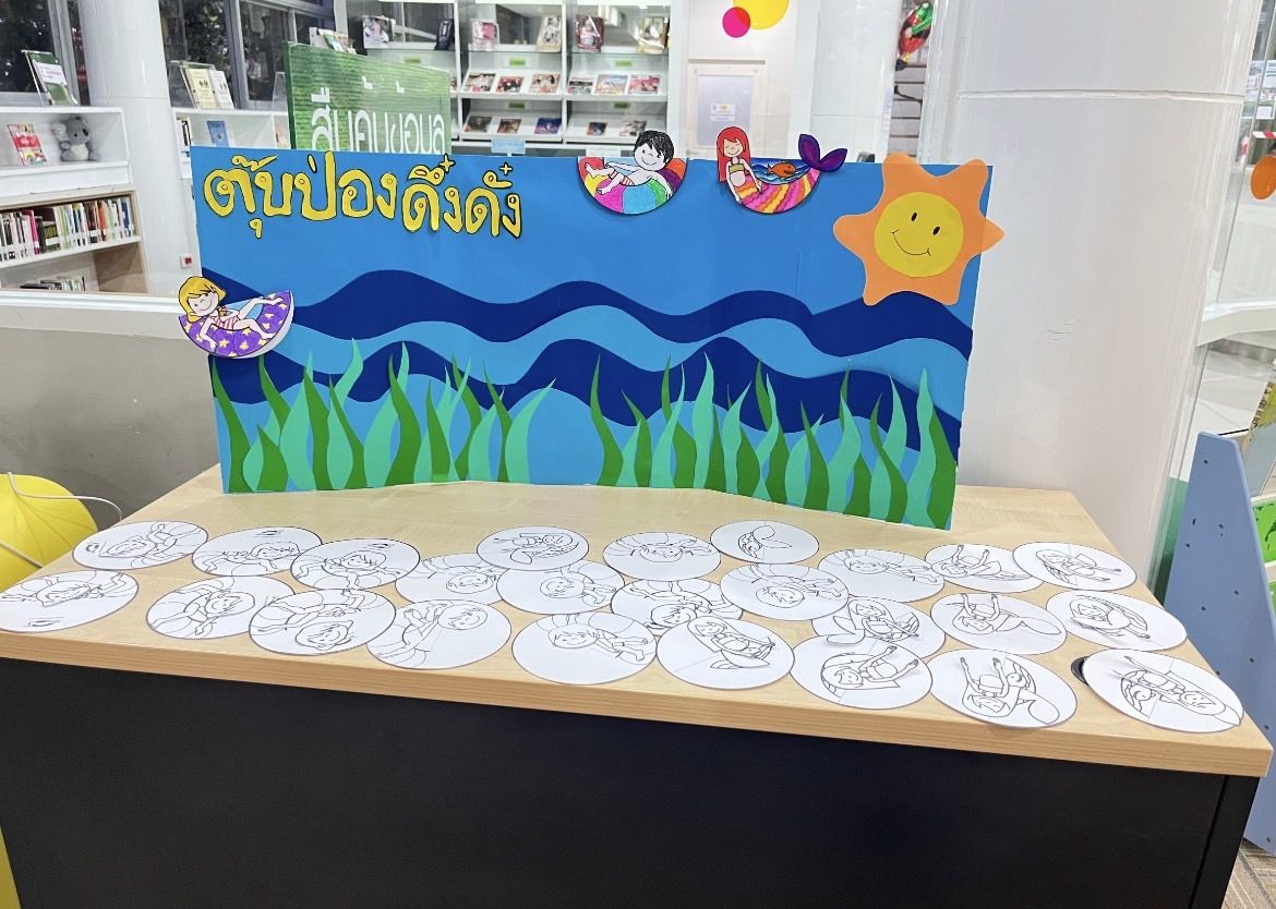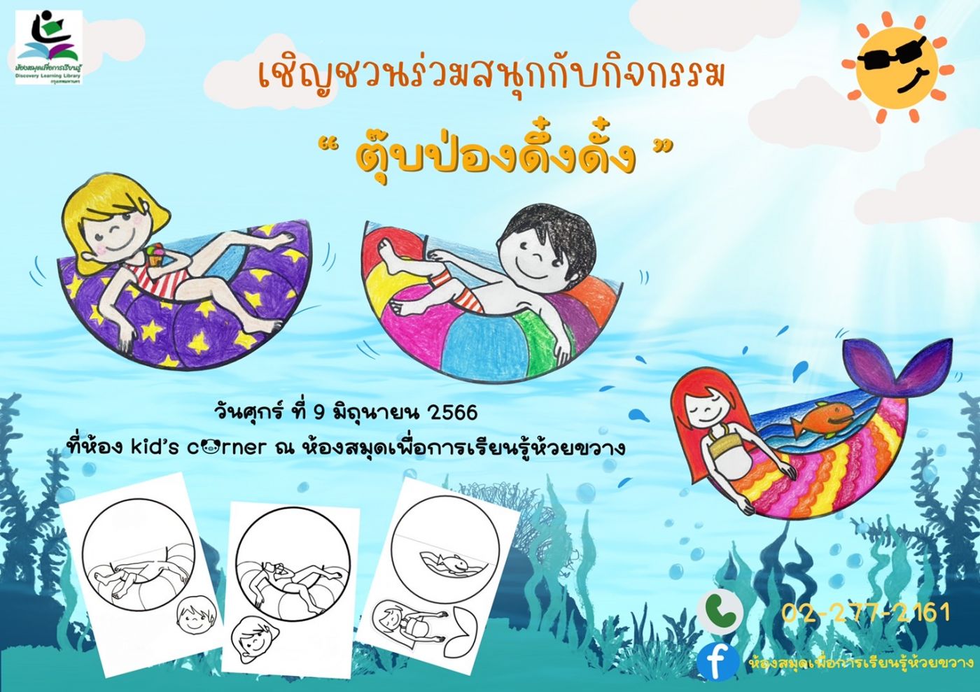 กิจกรรมใหญ่ของสัปดาห์นี้เราคิดชื่อกันขึ้นว่ากิจกรรม “ตุ๊บป่องดึ๋งดั๋ง” ซึ่งเป็นกิจกรรมที่ให้น้องๆได้ออกแบบห่วงยางในสไตล์ของตัวเองเพื่อนำไปลอยบนน้ำ ซึ่งเป็นน้ำสมมติที่เราจะทำขึ้นไว้ให้น้อง ๆโดยตัวเลือกครั้งนี้ก็จะมีเด็กผู้หญิงเด็กผู้ชายและตัวเลือกพิเศษก็คือนางเงือก ในระหว่างวันสองวันก่อนที่จะทำกิจกรรมนี้เราได้มีการโปรโมททั้งในเพจและติดป้ายไว้ที่หน้าห้องสมุดเด็กๆให้ความสนใจและเข้ามาถามว่าอันนี้จะได้ทำวันไหน หนูอยากทำแล้วหนูขอทำนางเงือก เราก็ช่วยโปรโมทกับน้องๆไปในตัวว่าถ้าอยากทำกิจกรรมนี้น้องๆต้องมาในวันศุกร์นะ ซึ่งพอถึงวันทำกิจกรรมจริงเด็กๆก็ให้ความสนใจกันเป็นอย่างมากโดยเฉพาะขั้นตอนของการแปะรูปของตนเองไว้บนท้องทะเลที่เราเตรียมไว้ให้ กลุ่มไหนที่มากันกับเพื่อนก็นัดกันติดในจุดที่อยู่ใกล้ ๆ กันซึ่งเรามองว่ามันเป็นภาพที่น่ารักมาก น้อง ๆ บางคนก็เลือกทำ 2 อัน เพราะน้องอยากเอากลับบ้านแต่ถ้าเอากลับบ้านก็จะไม่มีกิจกรรมติดน้องก็เลยเลือกที่จะทำ 2 อันเพื่อให้ได้นำ 1 อันกลับบ้านและอีกอันติดไว้กับเพื่อน ๆ