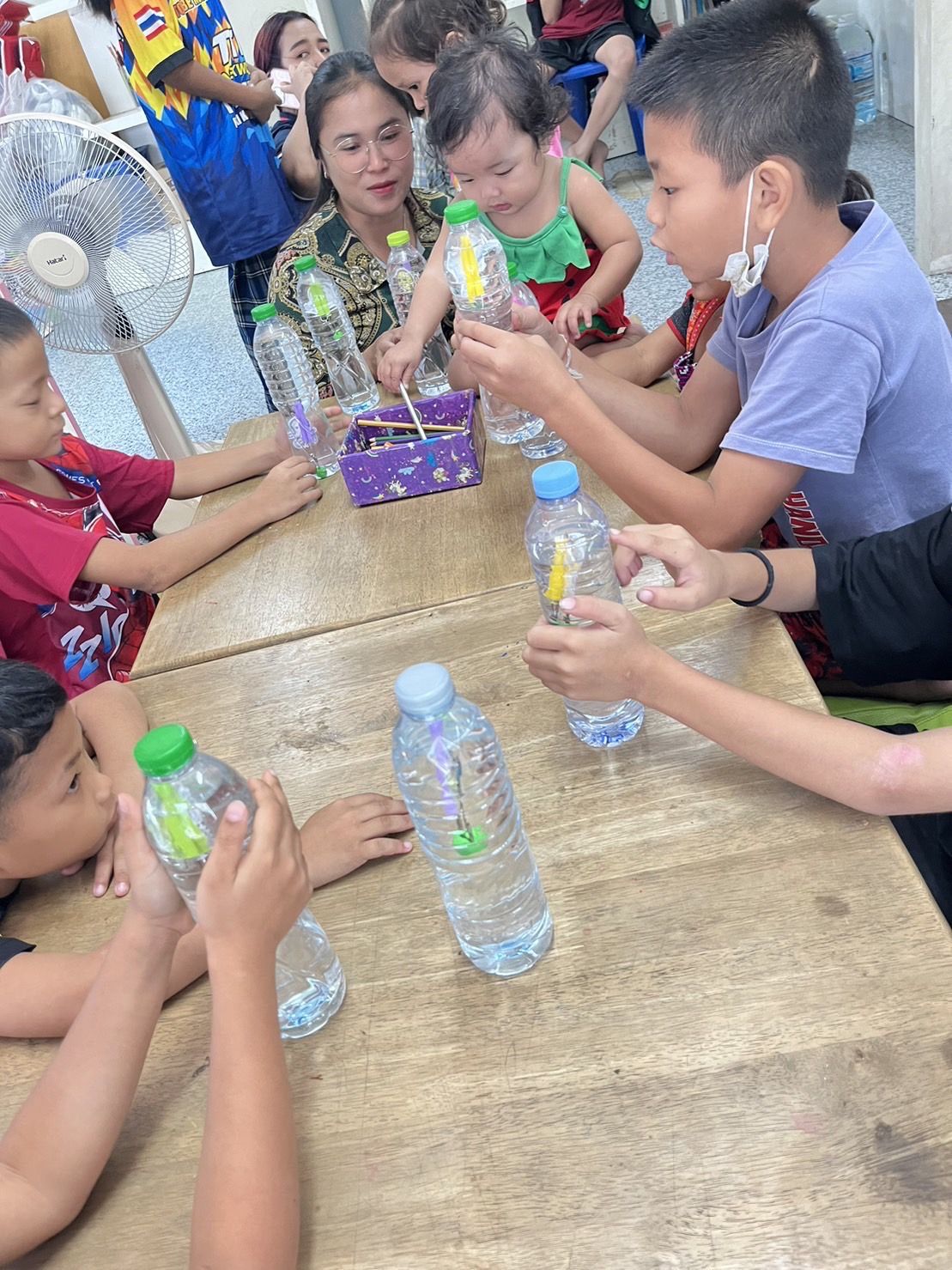 ตัดมากันที่วันเสาร์เรากลับไปที่บ้านหนังสืออีกครั้ง เด็ก ๆ จำกันได้ด้วยกรี้ดใส่พี่กันใหญ่ ฮ่าฮ่า กิจกรรมวันนี้เราทำเกี่ยวกับวิทยาศาสตร์เด็ก ๆ ตื่นเต้นกันมากเพราะนอกจะต้องทำกิจกรรมแล้วยังต้องลุ้นอีกว่าอันที่ตัวเองทำจะสำเร็จหรือไม่ บางคนจมน้ำตั้งแต่ยังไม่ได้บีบ บางคนบีบไม่ลง ที่วุ่นวายไปกว่านั้นคือเล่นไปได้ซักพักก็เกิดอาการพัง ไม่ลอบกลับคืนบ้าง บีบไม่จมบ้าง วิ่งวุ่นกันไปหมด สนุกมาก แต่พอบอกจะเล่นบิงโกทุกคนก็นั้งประจำที่กันเร็วมาก เหมือนขอแค่ให้ได้บิงคือพอใจแล้วขนมไม่เอาก็ได้แต่ต้องได้บิง ถึงกับสวดอ้อนวอนกันเลยที่เดียว กิจกรรมเสร็จก็ชวนกันเล่นซ่อนแอบเด็กชอบมากวิ่งไม่หยุด พอจะกลับก็ลากันแล้วก็ถามว่าเสาร์หน้ามาอีกไหม ซึมมากเราไม่อยากตอบเลยว่าจะไม่ได้มาแล้ว ฮืออ
