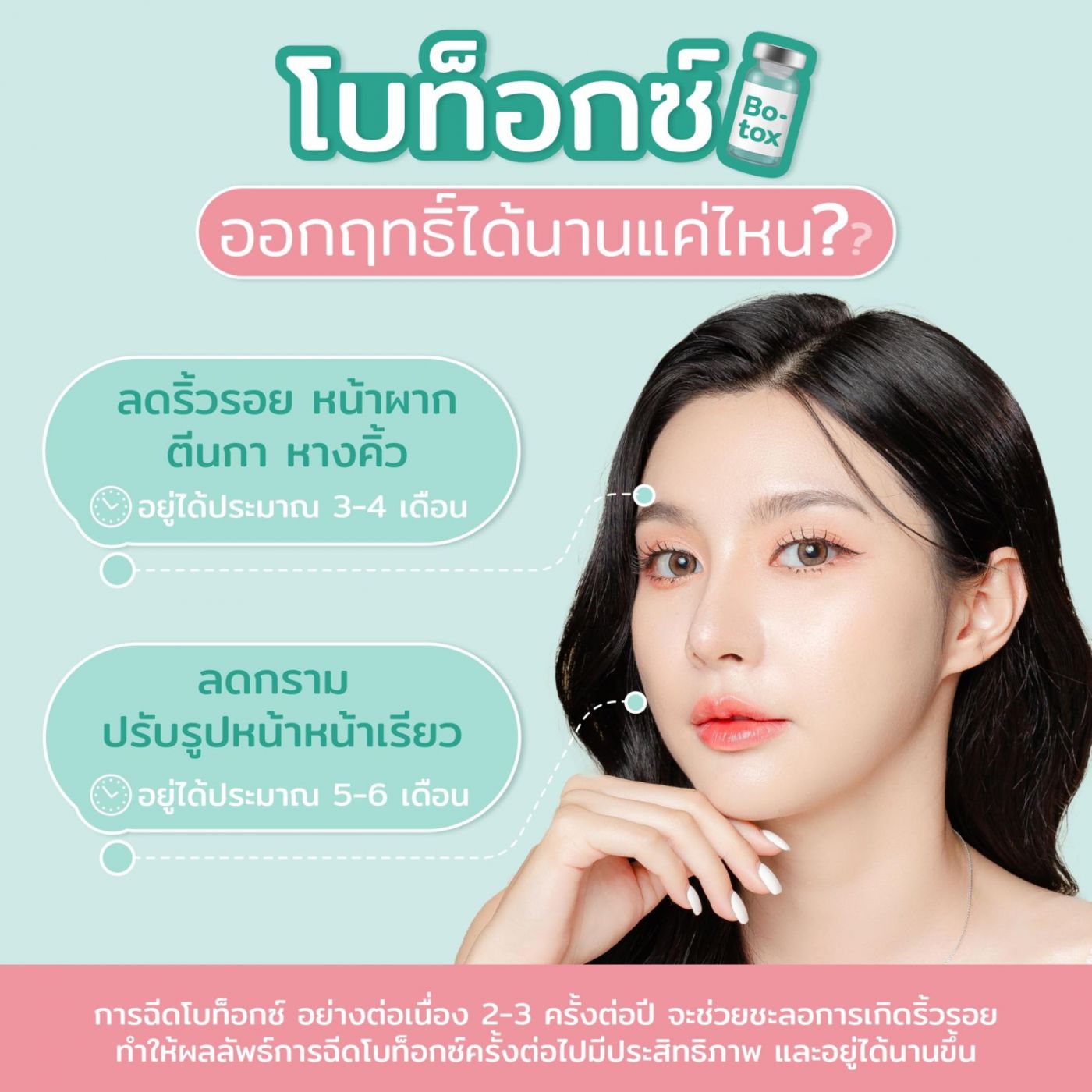 ลดริ้วรอย หน้าผาก ตีนกา หางคิ้ว : อยู่ได้นานประมาณ 3–4 เดือน ก่อนที่กล้ามเนื้อจะเริ่มกลับมาทำงานตามปกติ