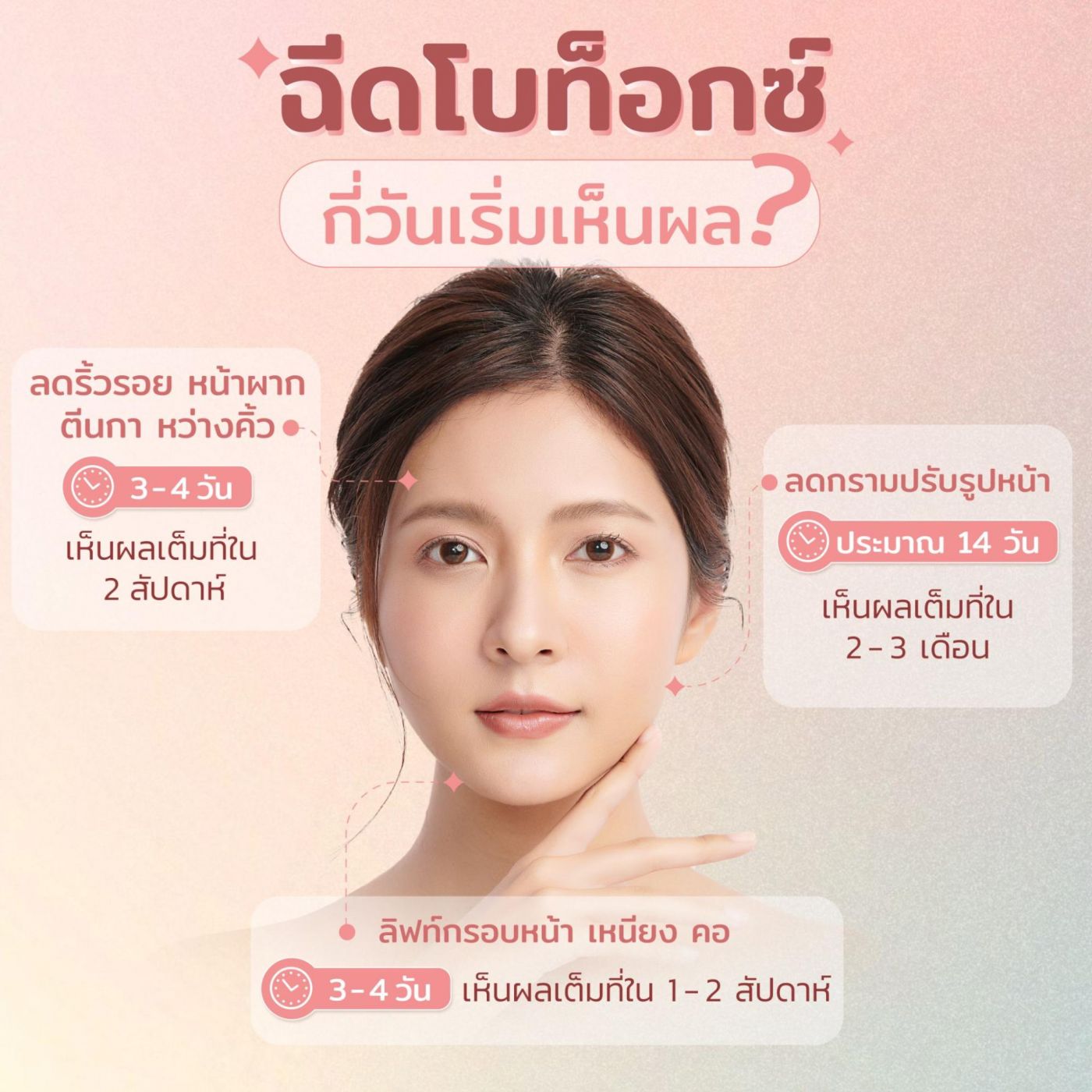 ลดกราม ปรับรูปหน้า : ใช้เวลาประมาณ 14 วัน จึงจะเริ่มเห็นการเปลี่ยนแปลง และเห็นผลเต็มที่ภายใน 2–3 เดือน