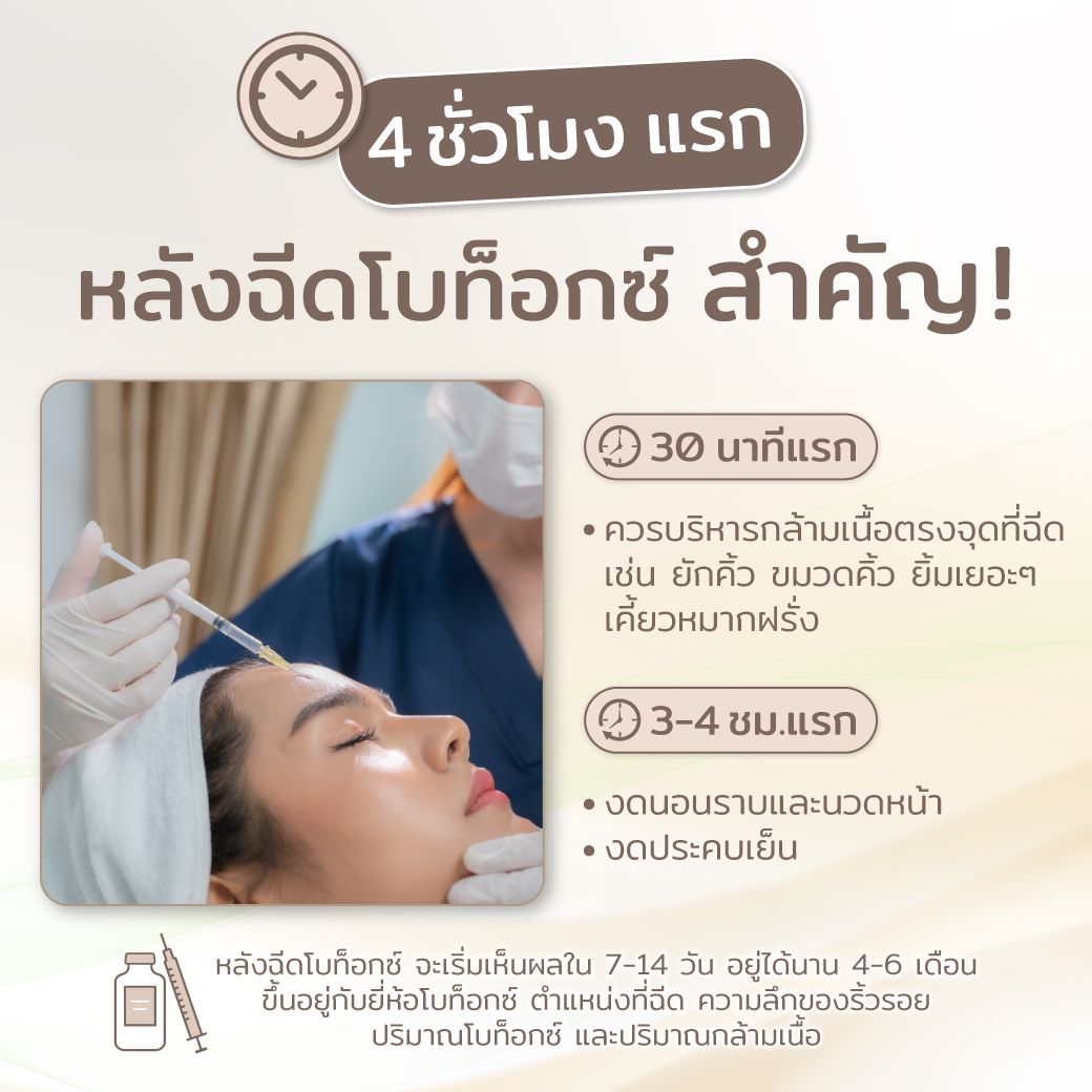 30 นาทีแรก ควรบริหารกล้ามเนื้อตรงจุดที่ฉีด เช่น ขมวดคิ้ว ยักคิ้ว หรือยิ้ม เพื่อช่วยให้ตัวยาออกฤทธิ์ได้ดีขึ้น