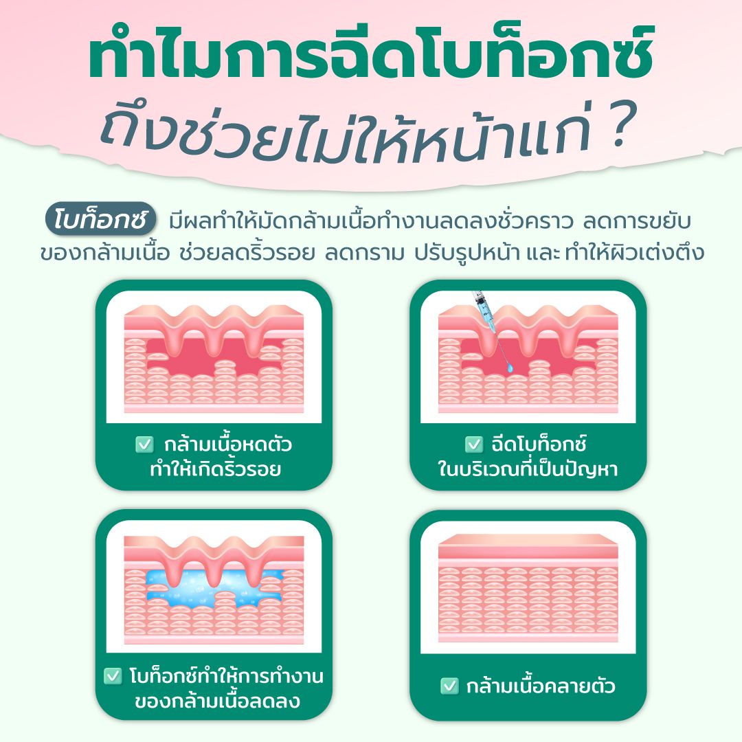 ซึ่งโบท็อกทำงานโดยการ ลดการทำงานของมัดกล้ามเนื้อชั่วคราว เมื่อฉีดเข้าสู่จุดที่มีปัญหา เช่น หน้าผาก หางตา หรือรอยย่นต่าง ๆ จะช่วยให้กล้ามเนื้อผ่อนคลาย ไม่ขยับซ้ำ ๆ จนก่อให้เกิดริ้วรอยใหม่ ส่งผลให้ผิวดูเรียบตึง กระชับขึ้น อีกทั้งยังช่วย ปรับรูปหน้า ลดกราม และทำให้ผิวเต่งตึง ทำให้ใบหน้าดูอ่อนเยาว์และไม่แก่ก่อนวัย