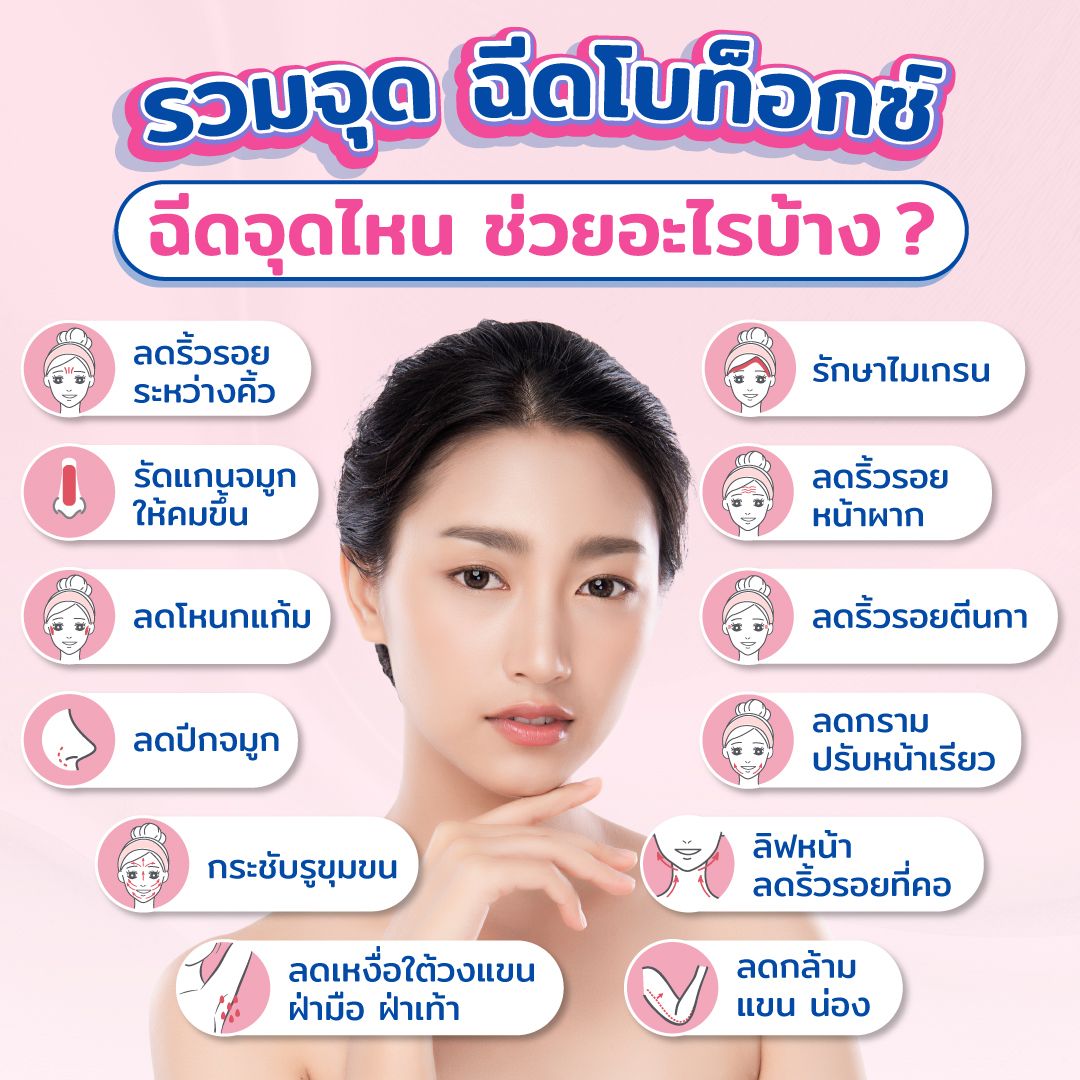 ฉีดโบท็อกกระชับรูขุมขน : ใช้ประมาณ 30–50 U ช่วยให้ผิวหน้าเรียบเนียน ลดความมัน และทำให้แต่งหน้าติดทนนานขึ้น