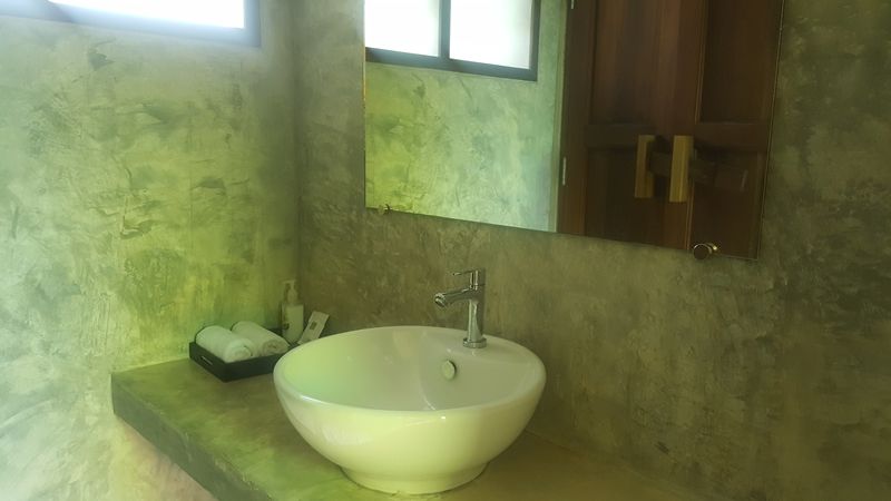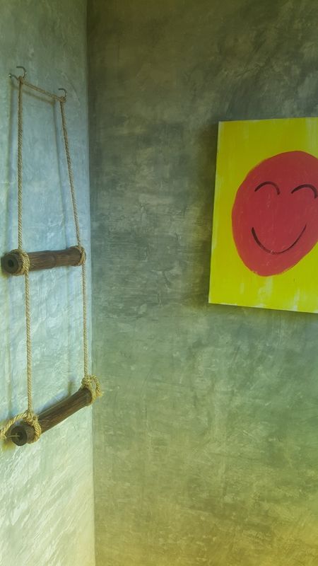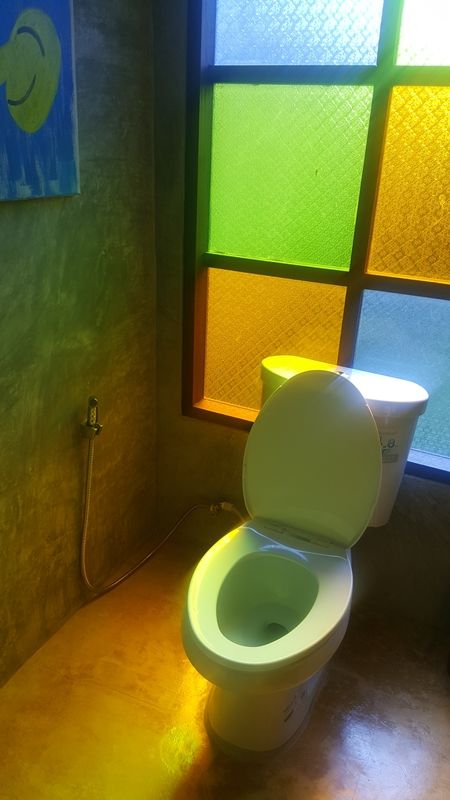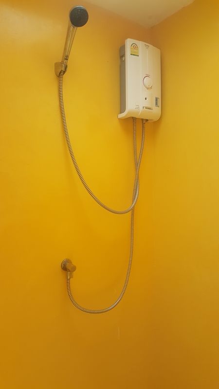 ถัดมาด้านในเป็นโซนอาบน้ำ ผนังสีเหลืองสดใส