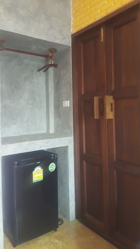 ที่ห้องมีตู้เย็นขนาดเล็ก ไม่มีตู้เสื้อผ้า แต่มีที่แขวนเสื้อแบบเปิด น่ารักดีค่ะ ?
