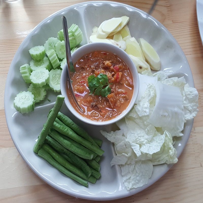 ถั่วฝักยาว แตงกวาก็มี ขิง ผักกาดขาวก็มา ล้อมวงถ้วยน้ำพริก เลือกได้ตามชอบใจ