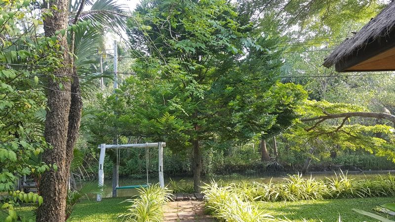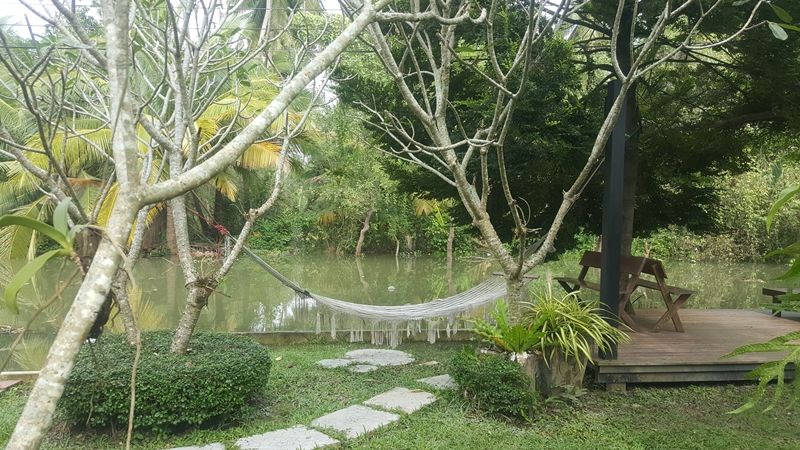 ต้นไม้ใหญ่ล้อมด้วยที่นั่งเป็นเกาะกลางของบ้านสามหลัง โอบด้วยบ่อปลา ทางรีสอร์ทวางอาหารปลาไว้ใครอยากเลี้ยงปลาก็หยอดเงินใส่กระปุกได้ ???
