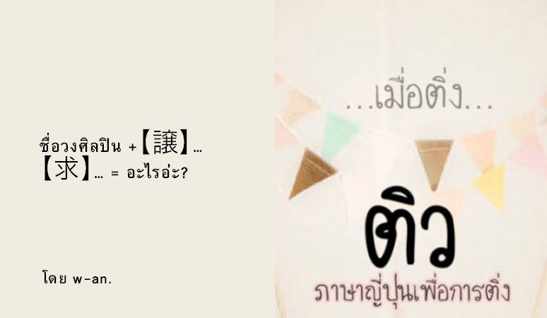 ชื่อวงศิลปิน +【譲】…【求】… = อะไรอ่ะ? โดย w-an.ความเชื่อผิดๆ ของมักเกิ้ลนอกวงการติ่งอย่างหนึ่ง คือการติ่งนั้นไม่ต้องใช้อะไรมากหรอก นอกจากความบ้าและเงิน...อื้อ ถูก (อ้าว) ก็การติ่งที่ไม่เสียเงินมันมีที่ไหนเล่า! *มินิมอร์ซบหน้าร้องไห้กับฝ่ามือ* แต่การติ่งหรือเป็นแฟนซัมติงนี่นอกจากจะใช้สองสิ่งข้างต้นแล้ว ยังต้องอาศัยความรู้หลายๆ อย่างนะคุณ w-an. ผู้มีความรู้ภาษาญีปุ่่น แน่นอนว่ามีความชอบเกี่ยวกับทางนั้น เขียนโพสต์แนะนำข้อมูลด้านภาษาเกี่ยวกับการแลกของในแวดวงติ่งค่ะ แล้วทำไมต้องแลกของ ต้องแลกในโกดังร้างมั้ย! (ก็ไม่ถึงขนาดนั้นหรอกนะ...) ที่ต้องแลกของเพราะว่าค่ายเพลง/ค่ายหนัง/ค่ายอนิเม นั้นช่างร้ายกาจ ทำของพรีเมียมออกมาหลายชุด แต่ละชุดแถมกับซีดีต่างอีดิชั่นงี้ บางทีก็แจกการ์ดมา แต่เหยยย แผ่นที่ซื้อไม่ใช่คนที่ชอบ ไม่ใช่เมนไง พอมีหลายๆ คนเข้าก็เลยเกิดวัฒนธรรมแลกของขึ้นมา เพราะไม่ใช่ว่าทุกคนจะมีเงินซื้อใหม่ เห็นไหม เอื้ออารีกันขนาดนี้เลยนะ