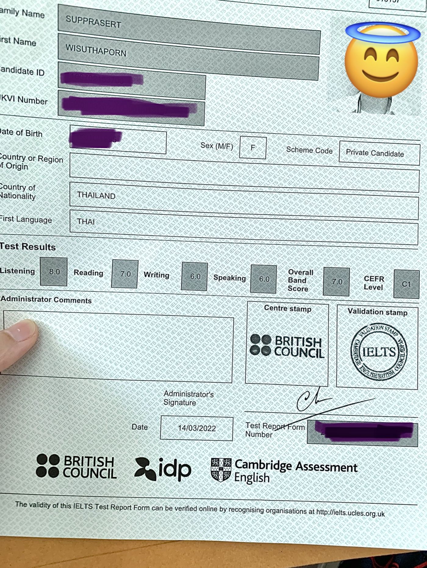 ซึ่งเราได้ Listening 8.0/ Reading 7.0/ Writing 6.0/ Speaking 6.0 Total Band 7.0