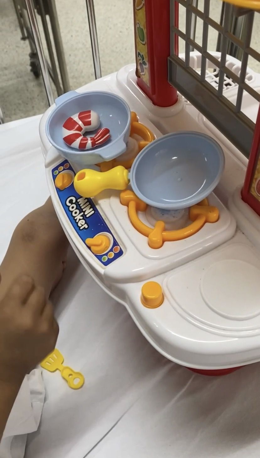 ในวันสุดท้ายเราก็ยังรับบทลูกค้าให้เด็ก ๆ อยู่ดี วันนี้ตั้งแผงพร้อมกันสามเตียง เราเป็นลูกค้าก็เดินวนซื้อไปค่ะเดี๋ยวพ่อค้าแม่ค้าตัวน้อยจะน้อยใจ อันนี้เป็นร้านข้าวผัด อีกสองแผงขายก๋วยเตี๋ยวกับเบเกอรี่ ครบเลยค่ะของคาวของหวาน