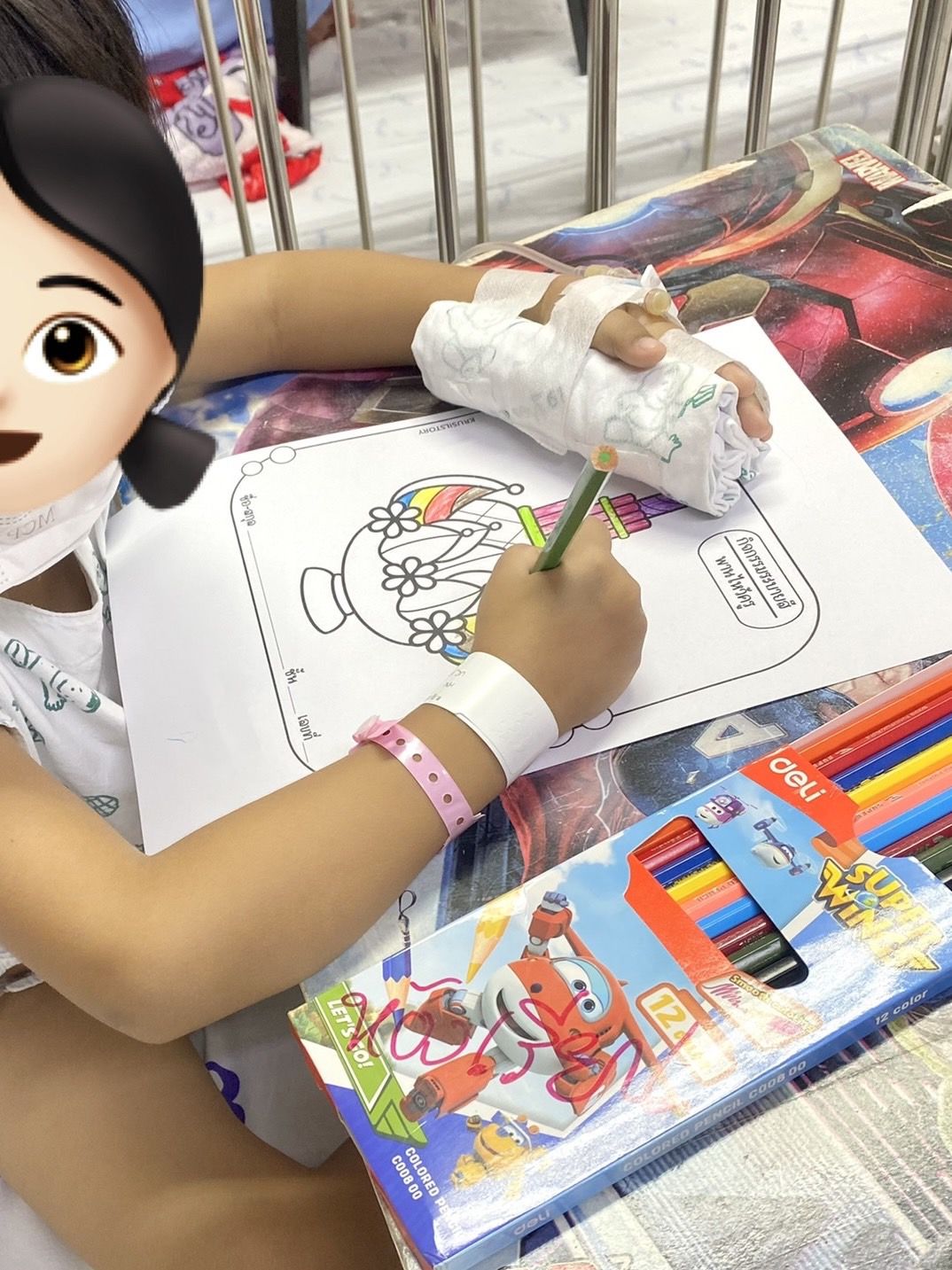 เรากับพี่เจี๊ยบจึงได้เตรียมอุปกรณ์ต่าง ๆ ให้น้อง ๆ พร้อมที่จะไปให้ทุกคนทำกิจกรรมกัน เราก็ได้เข้ามาเจอน้องที่ป่วยในวอร์ดเป็นครั้งแรก เด็กค่อนข้างเยอะเลยค่ะแต่ว่าคนที่มีแรงพอจะทำกิจกรรมนั้นมีเพียงส่วนหนึ่งเท่านั้น แต่น้อง ๆ ทุกคนน่ารักมากค่ะ ว่านอนสอนง่าย ส่วนใหญ่อายุประมาณ 2-10 ปีกันทั้งนั้น น้องเห็นว่าคุณครูมีกิจกรรมระบายสีมาให้ก็อยากทำกันใหญ่ บางคนก็ระบายสีสวยมาก เราเห็นแล้วก็ได้แต่อวยพรให้น้อง ๆ ทุกคนหายป่วยไว ๆ