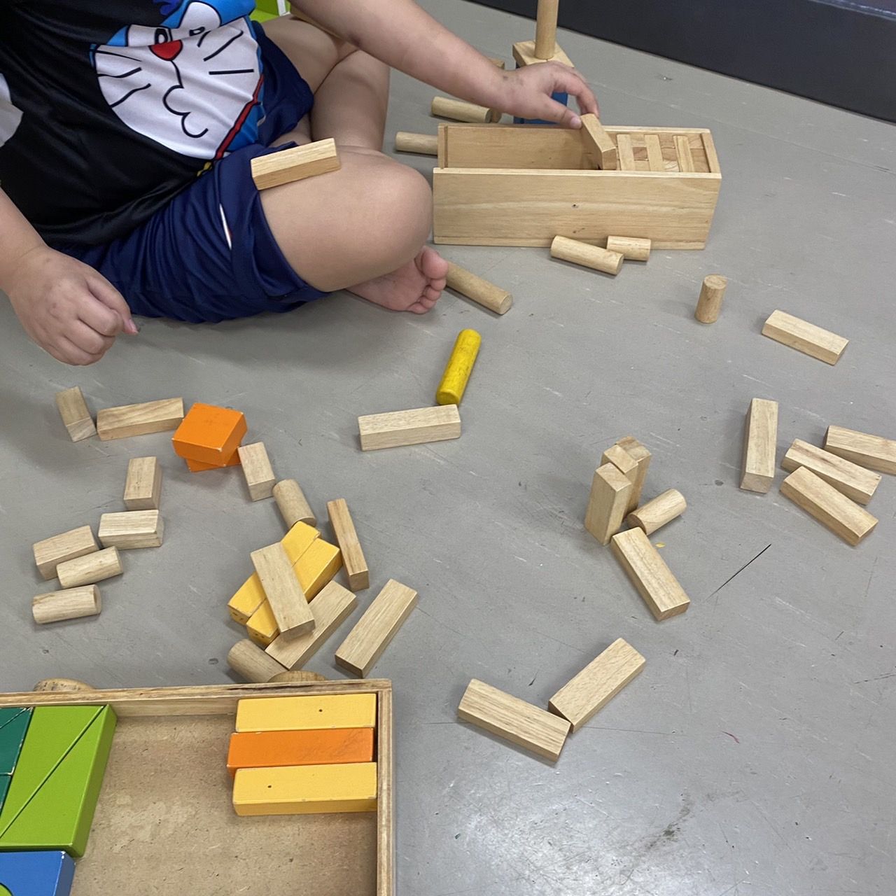 น้องโฟล์คเตรียมตัวกลับบ้านจึงมารอคุณยายที่ห้องเรียน ชวนเราไปเล่นบล็อกไม้ด้วย