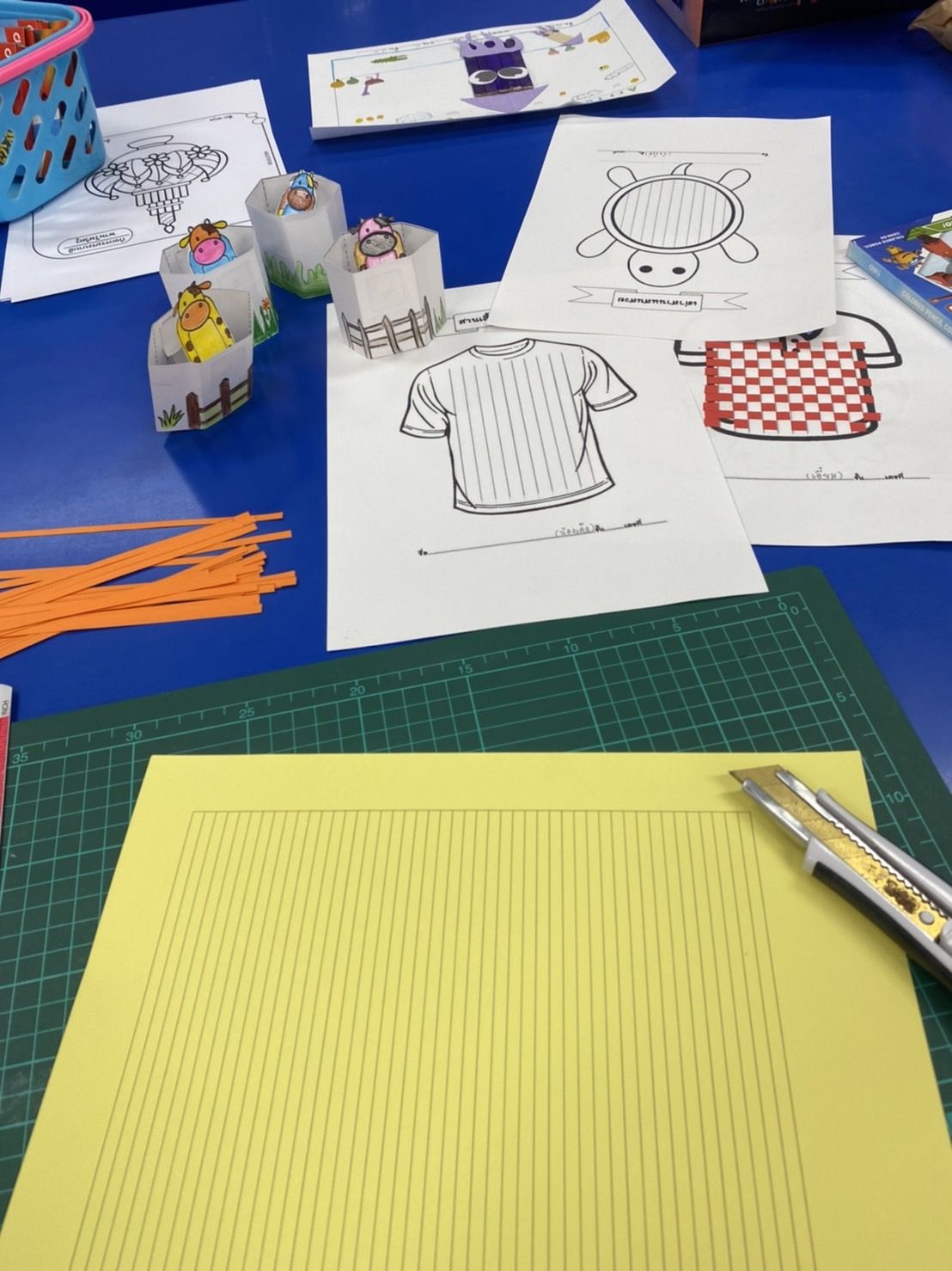 เตรียมอุปกรณ์ หากิจกรรมให้เด็ก ๆ ทำกันในวันนี้โดยเราทำหน้าที่ตัดกระดาษเป็นเส้นเล็ก ๆ เพื่อนำไปสานกับกระดาษ