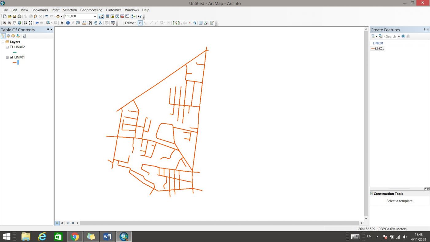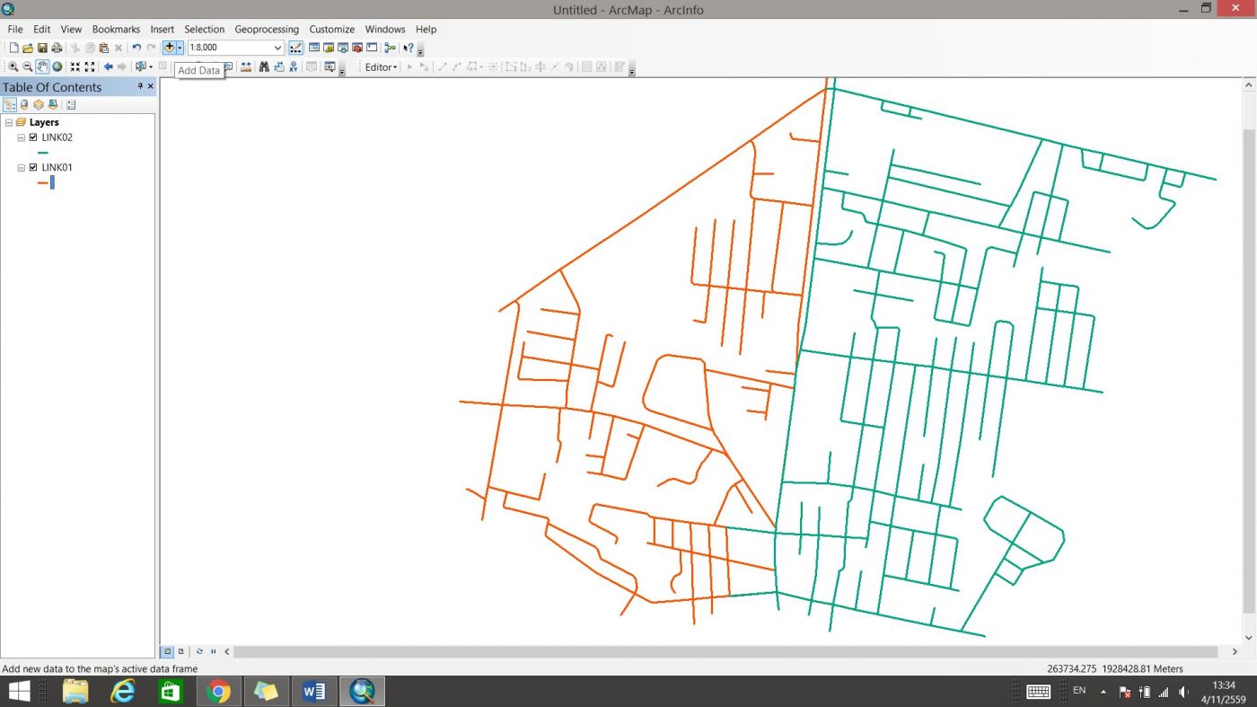 นำเข้าข้อมูลส่วนแรก (LINK01.shp) และส่วนที่สอง (LINK02.shp) เข้ามาโดยคลิกที่ “Add Data”
