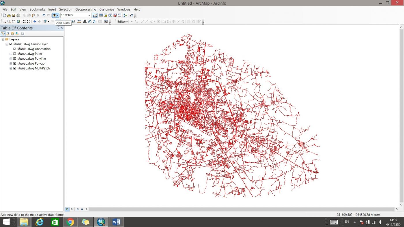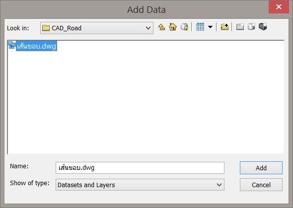 เปิดโปรแกรม ArcGIS และเพิ่มข้อมูลจากโปรแกรม AutoCAD เข้ามาด้วยคลิกที่ Add Data
