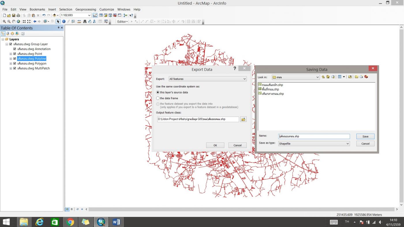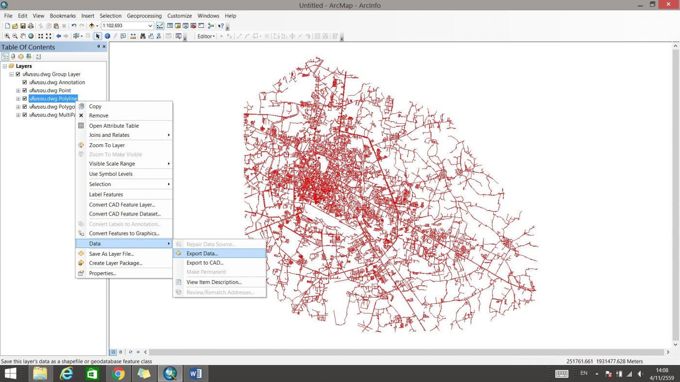คลิกที่ประเภทของข้อมูลที่ต้องการแปลงเป็นไฟล์ GIS ในที่นี่ ต้องการข้อมูลเส้น (Polyline) จึงคลิกขวาที่ “เส้นขอบ.dwg Polyline” ->
