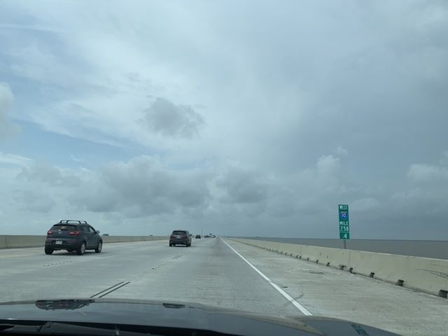 ก่อนใกล้จะถึง New Orleans เราจะต้องขับรถขึ้นสะพานและผ่านแม่น้ำ Mississippi เราและ Daniela ตื่นเต้นกันใหญ่เพราะมันใหญ่และกว้างสุดลูกหูลูกตามาก ถ้าสะพานล่มมาคือตาย อย่างเดียว ไม่น่ารอดกลับไปเจอใครทั้งนั้น
