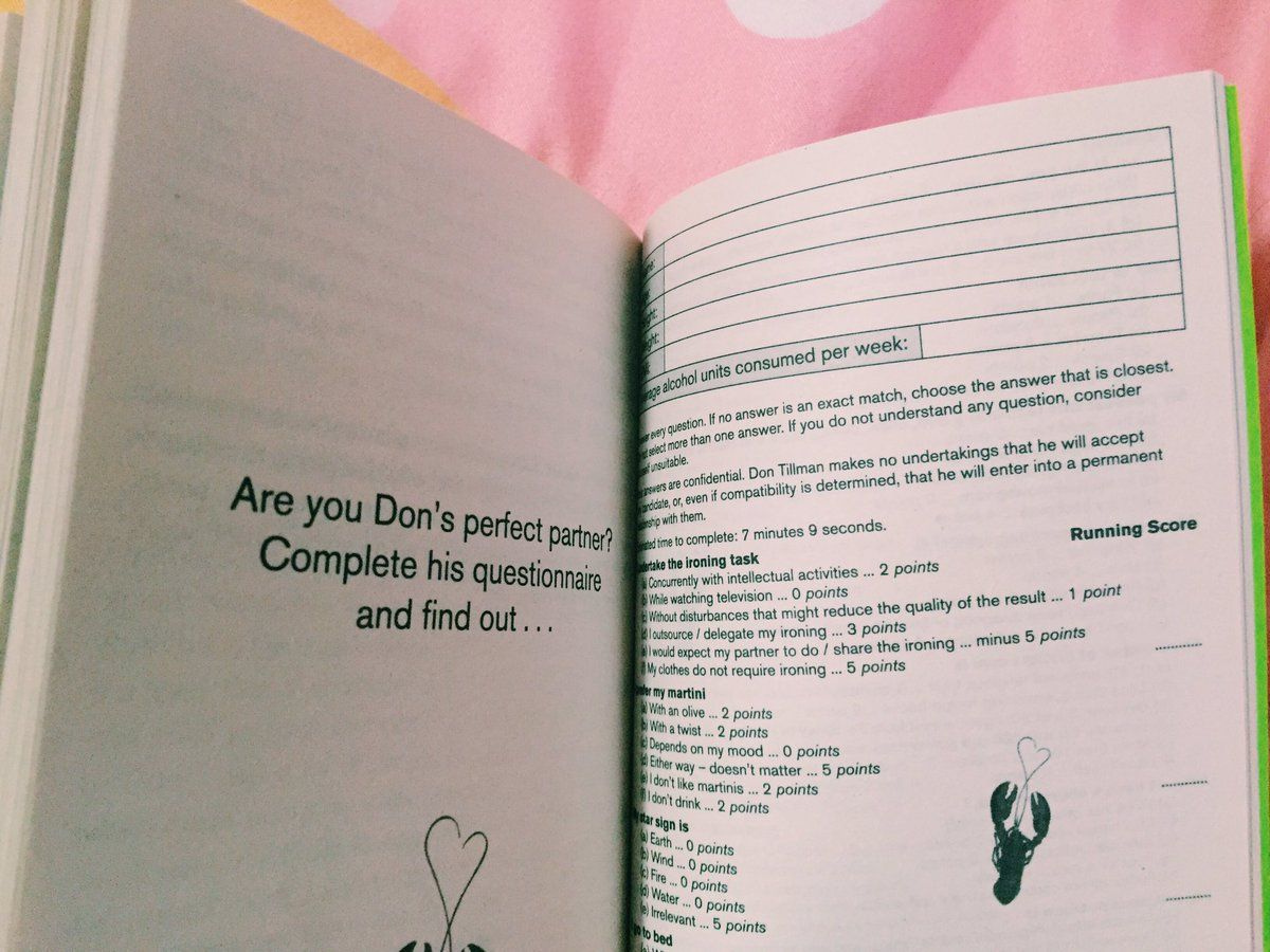 ถ้าถามว่าอะไรคือจุดเด่นของเรื่องนี้ คนอ่านเก้าในสิบน่าจะตอบว่า “พระเอก” ถ้าอยากชัดเจนกว่านี้ก็ “ความแปลกของพระเอก” เพราะ Don เป็นมนุษย์ Perfectionist ที่เราไม่คุ้นเคย แต่จากปากผู้เขียน คนแบบ Don เจอได้ทั่วไปในหมู่นักวิทยาศาสตร์ นักศึกษาปริญญาเอก ศาสตราจารย์ เอาง่ายๆคือฉลาดและหัวไปทางวิทย์ เพราะ Don มีพลังแห่งตรรกะอยู่ในตัวอย่างเต็มเปี่ยม การกระทำของ Don แสดงออกว่าเขามีความรู้และให้ความสำคัญกับเหตุผลมาก (ทั้งเรื่องคือนางไม่ fallacious นะจ๊ะ พยายามจะใช้ถ้อยคำแสดงการประเมินอย่างถี่ถ้วน เช่น probably, unlikely, might,highly possible เพราะคำนึงถึง all possible outcomes ตลอดเวลา กลัว) ไม่หลุดคาแรกเตอร์เลยทั้งเรื่องถึงแม้บางครั้งจะอ่านแล้วชวนปวดตับ แต่หลักๆคือเราตกหลุมรักแฮะ ///- รู้สึกว่าผู้ชายฉลาดและมีเหตุผลเนี่ยมีเสน่ห์สุดแล้ว อีกทั้ง Don ยังมีความน่ารักที่นางไม่รู้ตัว เช่น การที่นางแคร์ความรู้สึกคนอื่นแต่หาเหตุผลอื่นมากลบ ยิ่งฉากหลังๆที่ Don เริ่มรู้สึกถึงอารมณ์ตัวเองแล้วยิ่งน่าเอ็นดู คนเรามักจะเป็นเด็กและใหม่กับอะไรสักอย่าง ต่อให้เชี่ยวชาญด้านวิชาการแค่ไหนก็ตาม