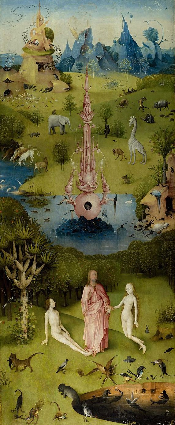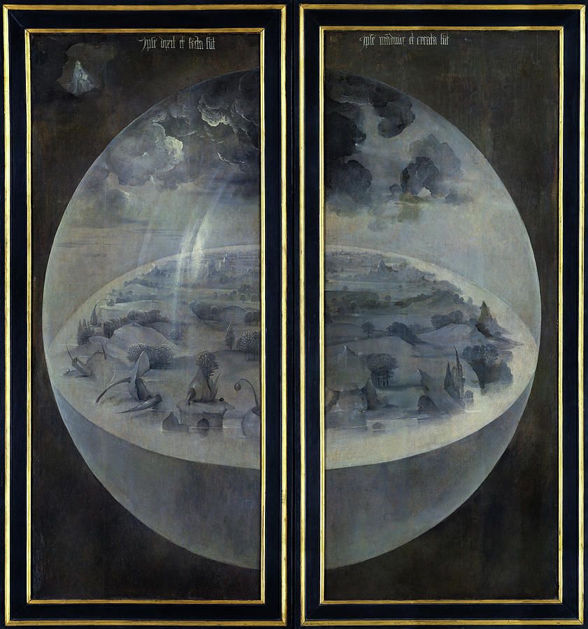 ภาพ The Garden of Earthly Delights หลังบานพับถูกเปิดออก แบ่งออกเป็นสามโลกด้วยกัน สวรรค์(ซ้าย) โลกมนุษย์(กลาง) นรก(ขวา)