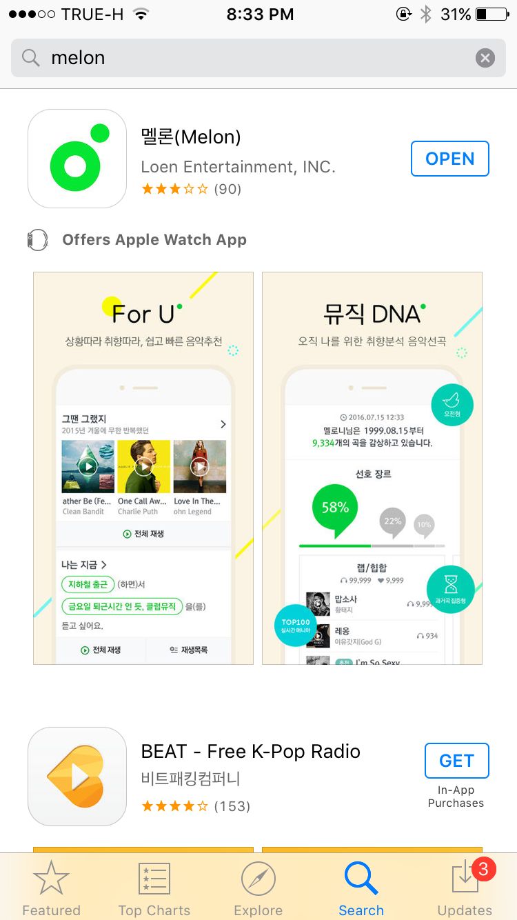 ได้ไอดีเกาหลีกันเรียบร้อยแล้วก็ไปเสิร์ชหาแอพเลยค่ะ พิมพ์ Melon ภาษาอังกฤษได้