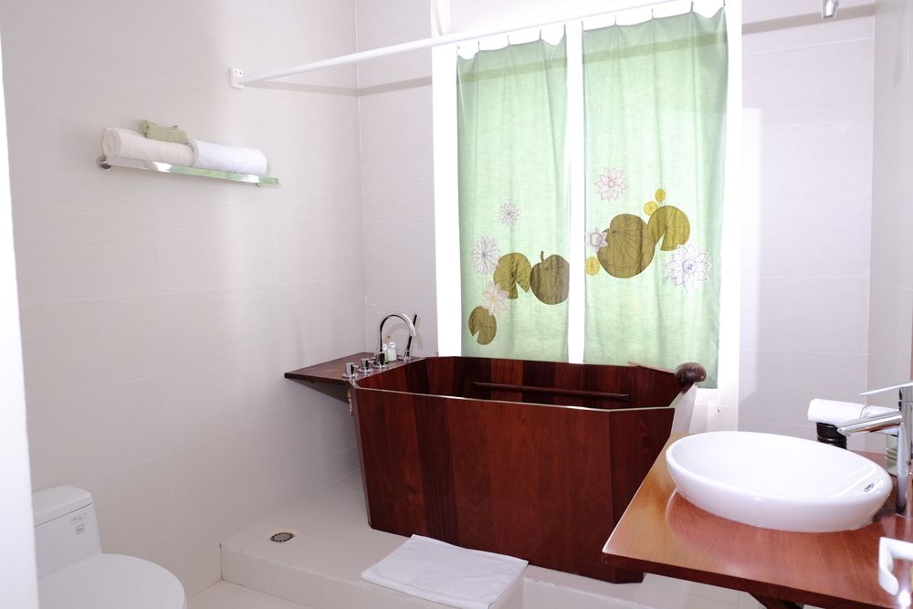 หลังๆเริ่มจับสไตล์การตกแต่งแบบเวียดนามได้คือ เค้าชอบตกแต่งกระเบื้องผสมปูนแล้วโชว์ลวดลายกระเบื้องสีสดๆ เป็นแบบนี้แทบทุกที่ที่ไป โรงแรมที่ว่าก็ใช่ แต่เค้าเพิ่มความฮิปเข้าไปด้วยการทาสีขาว ผสมกับ เฟอร์นิเจอร์ไม้