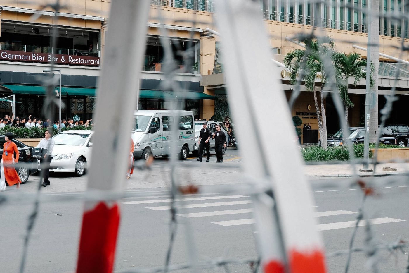 โอ๊ะ มีรั้วหนามกั้นด้วย แล้วทหารมากันทำไมเยอะแยะ มีรถสีดำคันหรูจอดแสตนด์บายอยู่หน้าโรงแรมอีกฝั่งของถนนสองสามคัน มีคนใส่สูทพ่วงไมค์โครโฟนที่หูทุกคน เดินไปเดินมาบริเวณหน้าโรงแรมแบบมีเงื่อนงำ หน้าตาดี๊ดี มีกล้ามด้วย