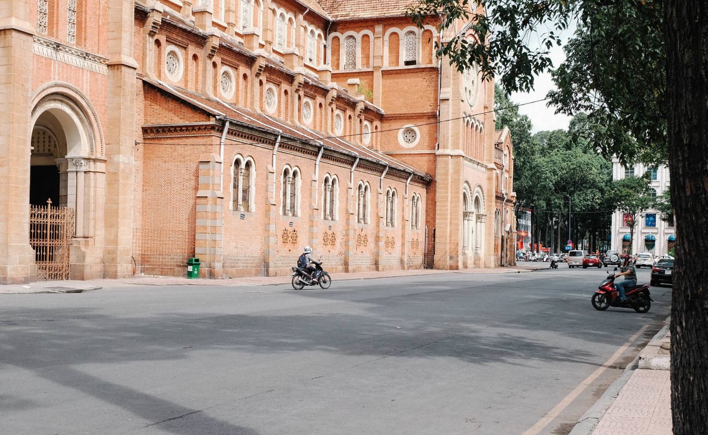 โบสถ์นอร์ท เทรอ ดาม เป็นโบสถ์นิกายคาทอลิก สร้างขึ้นในสมัยฝรั่งเศสล่าอาณานิคม ว่ากันง่ายๆ มันคือการที่ฝรั่งเศสปักธงเมืองโฮจิมินห์ชูคอ ชูชัยว่า ฉันมาที่นี่แล้วนะเว้ย โบสถ์ที่สร้าง จะถือเป็นการกำหนดจุดศูนย์กลางของเมืองขึ้นมา รอบๆวางผังถนนที่ว่างเป็นรูปสี่เหลี่ยมจัสตุรัสโดยมีโบสถ์อยู่ตรงกลาง คนจึงเรียกย่านนี้ว่า จัสตุรัสนอร์ทเทรอ ดาม (Notre Dame Square)