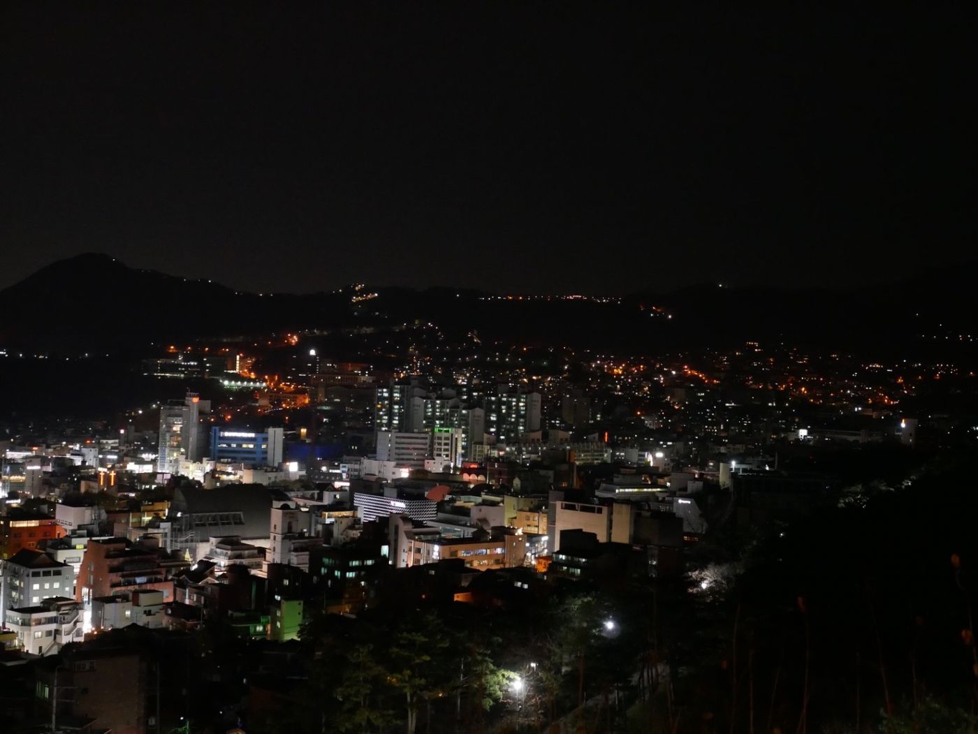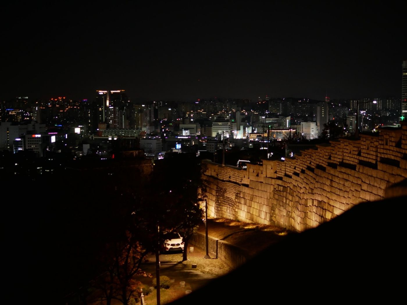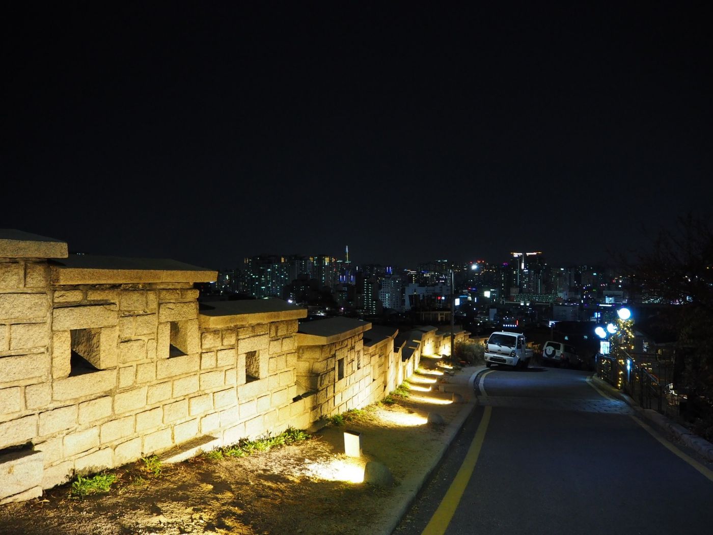 ออกจากร้าน ท้องฟ้าก็มืดพอดี เดินต่อขึ้นไปบนเขา ชมหมู่บ้านอีฮวา กับวิวเมืองยามค่ำคืน ลัดเลาะกำแพงเมือง สุดทางที่ทงแดมุนพอดี
