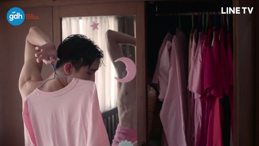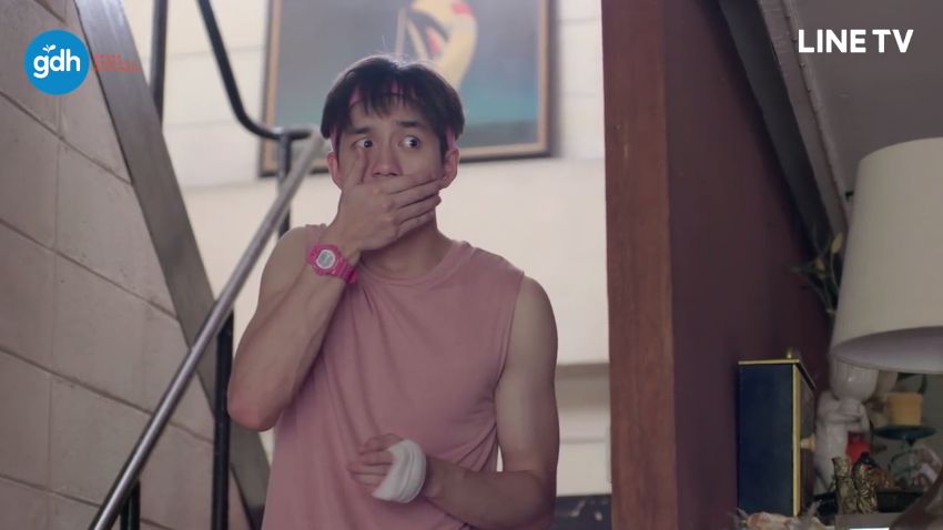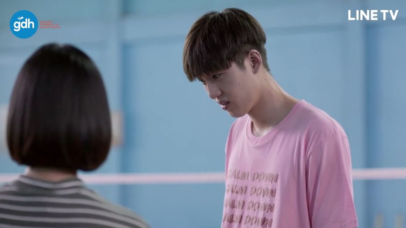 เราสะดุดตากับเสื้อสีชมพูหวานแว๋วสกรีนคำสั้นๆ แสดงตัวตนของพี่ยิมตั้งแต่ EP.1