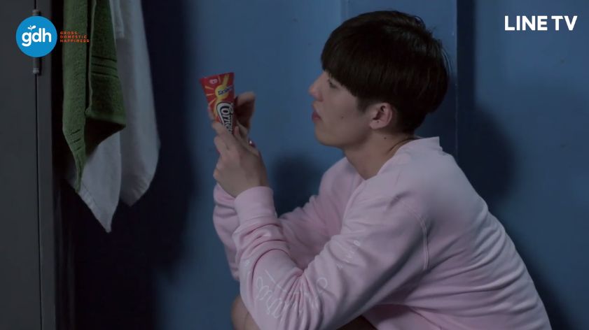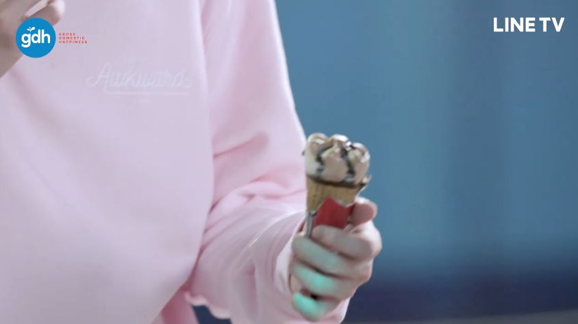 ปักคำว่า Awkward สีขาวจางๆ อยู่ที่อกพี่ยิม ข้างๆ ไอติมที่ตั้งใจแกะให้น้องหน่อย