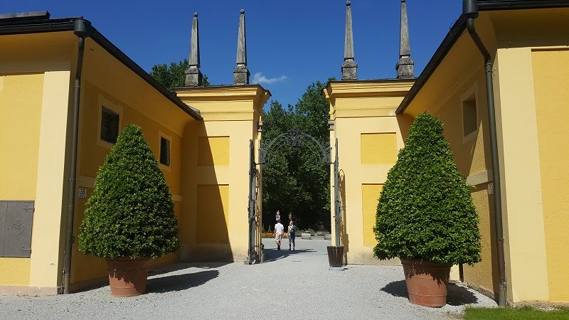 ใช้เวลาเดินทางไม่นานก็ถึงพระราชวังเฮลล์บรุนน์ (SCHLOSS HELLBRUNN) แค่เห็นโลมาก็ชอบแล้ว ทางเข้าเป็นกำแพงสีเหลืองสวยขนาบยาวไป ดูน่ารักดี