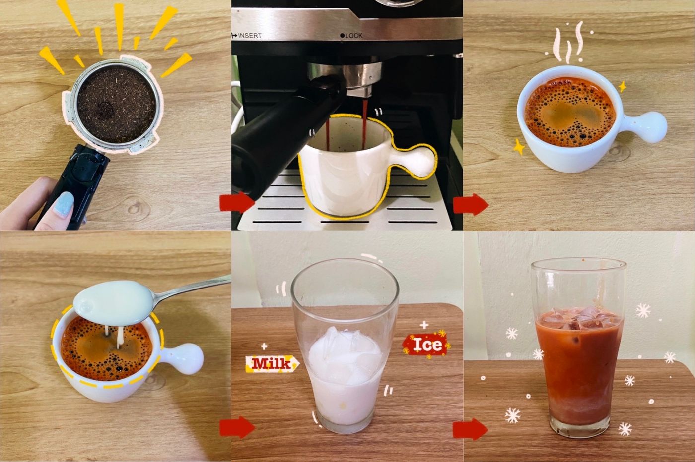 1. นำใบชาบด 1 ช้อนโต๊ะมาชงกับเครื่องชงกาแฟ espresso ให้ได้ปริมาณเท่ากับ 1 แก้วเล็กหรือ 50 มล.