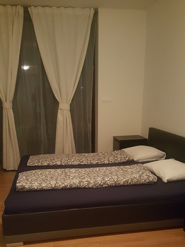 ที่พักอยู่ชั้น 4 มี 2 ห้องนอน และมีเตียงนอนในพื้นที่ส่วนกลางที่เป็นโซนครัว โซนนั่งเล่นด้วย ห้องน้ำในตัว 1 ห้อง และห้องน้ำส่วนกลางอีก 1 ห้อง มีผ้าเช็ดตัว ไม้แขวนเสื้อเยอะอยู่ สบู่ ยาสระผมก็มีให้ด้วย